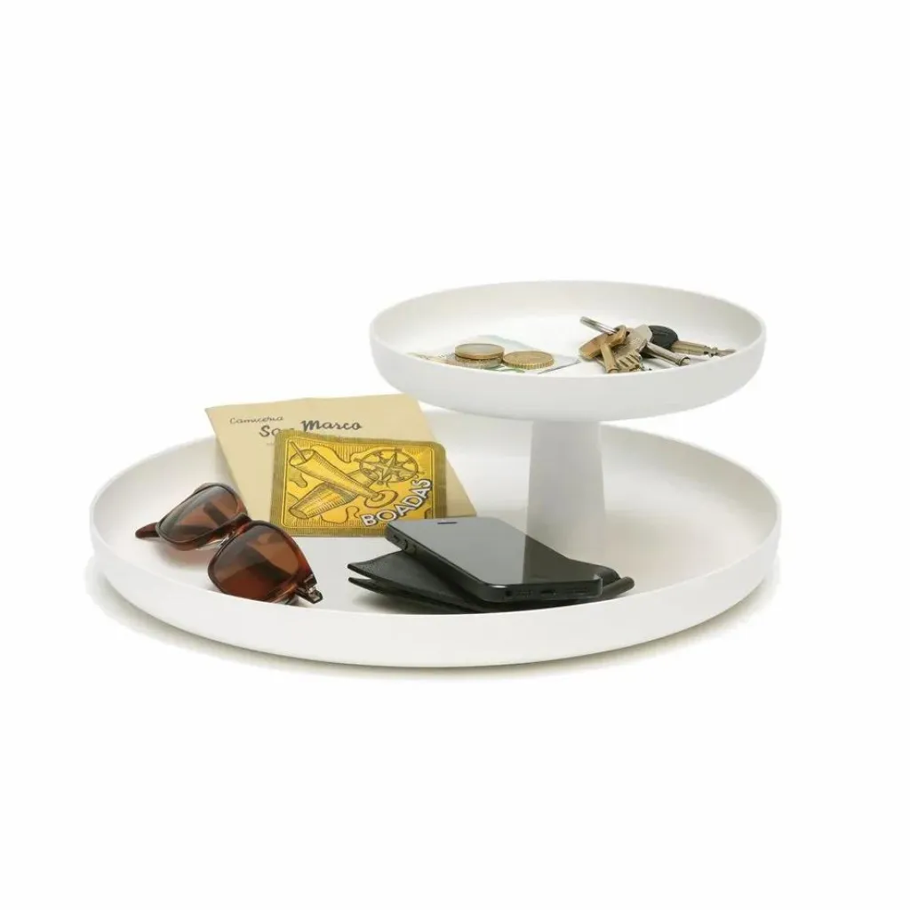 Rotary Tray, créé par Jasper Morrison, est une versioncontemporaine du plateau à étages classique. De langage formel et de couleursobre, Rotary Tray s’intègre tout naturellement dans chaque style d’aménagement et convient aux utilisations les plusvariées. Que ce soit dans la cuisine, la salle à manger, la salle de bain, l’entrée, le bureau ou lachambre d’enfants, Rotary Tray permet de mettre de l’ordre de manière décorative.