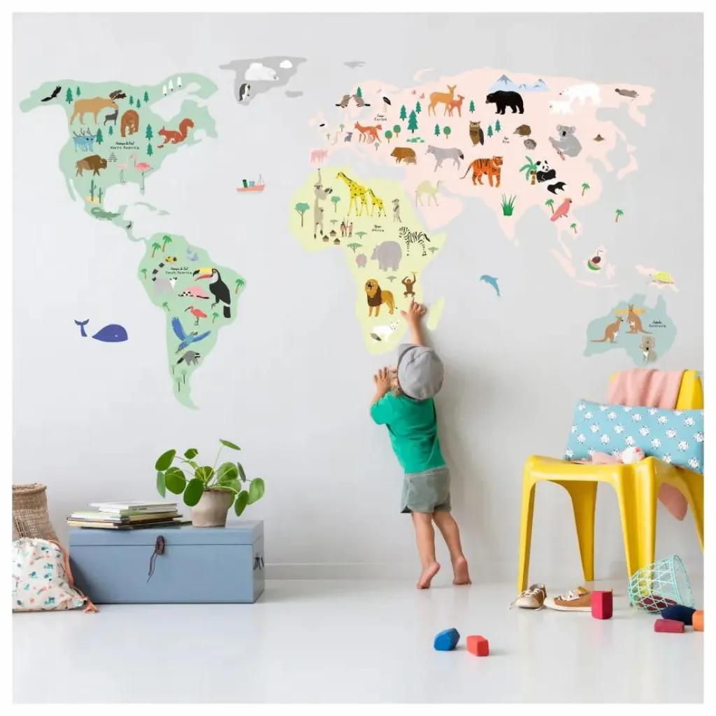 Cette mappemonde regroupe les animaux emblématiques des différents pays composant notre monde. C’est une belle façon de décorer votre intérieur tout en permettant à votre enfant de découvrir cette richesse.