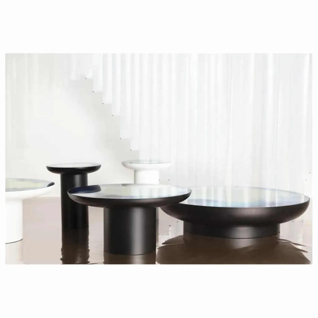 Les tables basses miroir FRANCIS sont nées du croisement de formes totémiques et solennelles avec le miroir iconique de Petite Friture, détenteur du Wallpaper Design Award. Pour cette réinvention de FRANCIS, la designer Constance Guisset a réalisé à la main des aquarelles en jouant avec deux séries de teintes. Les aquarelles ont ensuite été travaillées numériquement pour amplifier le jeu de transparence des couleurs, renforcer ou adoucir le mouvement des pigments et ainsi donner naissance à six aquarelles uniques. Puis, les aquarelles imprimées sur du miroir ont été saisies dans un feuilletage de verre apportant profondeur au regard et résistance à ces tables fonctionnelles.