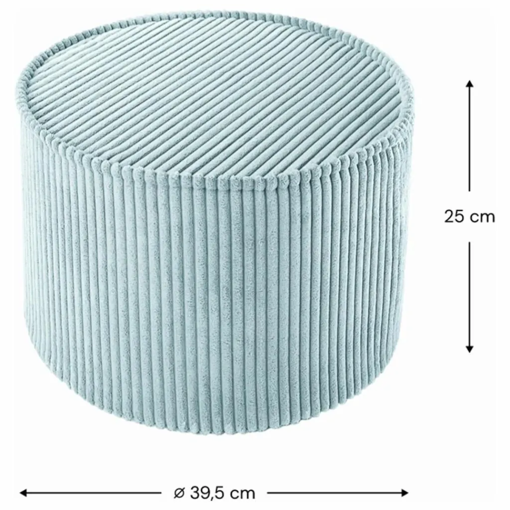 - Âge approprié : 3 – 7 ans. Taille : Diamètre : 39,5 x hauteur 25 cm (15,5 x 9,8 pouces) Poids : 1 kg (2,2 lbs) Coque extérieure : velours côtelé à larges fils, certifié OEKO-TEX® et GRS®, fabriqué à partir de bouteilles PET recyclées, 100 % polyester. Rembourrage : Mousse de polyuréthane certifiée ISO. Housse amovible : lavable en machine à 30°C avec des couleurs similaires. Fabriqué en Lettonie, UE.