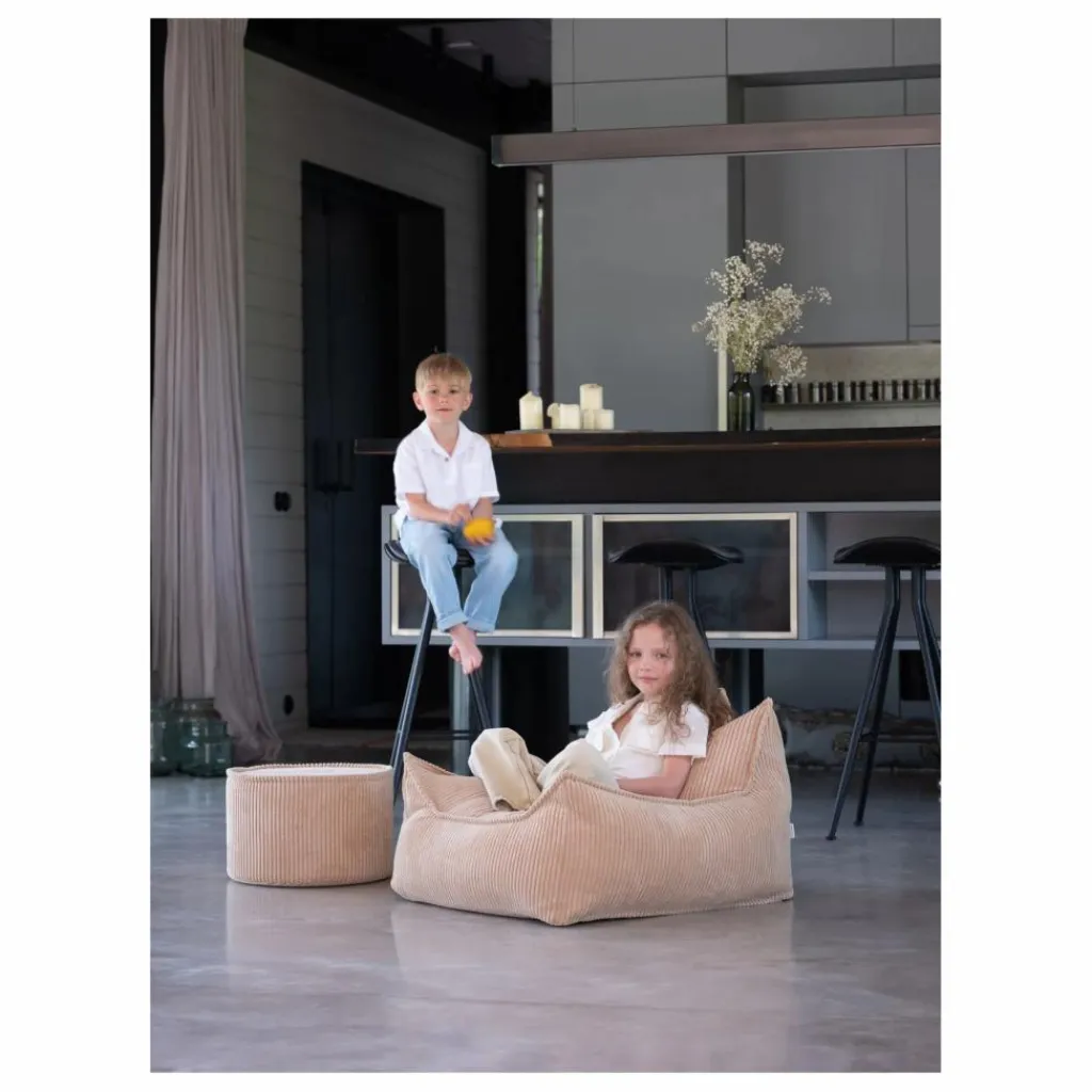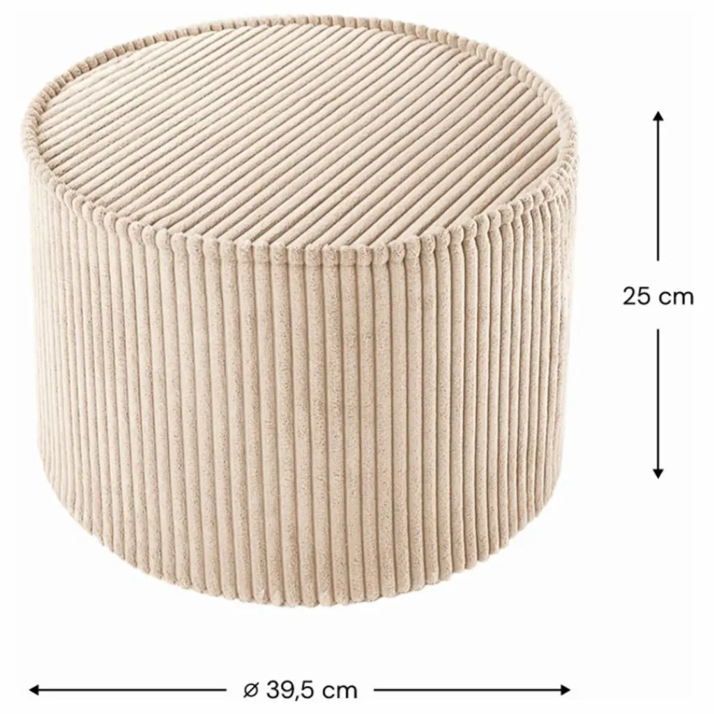 - Âge approprié : 3 – 7 ans. Taille : Diamètre : 39,5 x hauteur 25 cm (15,5 x 9,8 pouces) Poids : 1 kg (2,2 lbs) Coque extérieure : velours côtelé à larges fils, certifié OEKO-TEX® et GRS®, fabriqué à partir de bouteilles PET recyclées, 100 % polyester. Rembourrage : Mousse de polyuréthane certifiée ISO. Housse amovible : lavable en machine à 30°C avec des couleurs similaires. Fabriqué en Lettonie, UE.