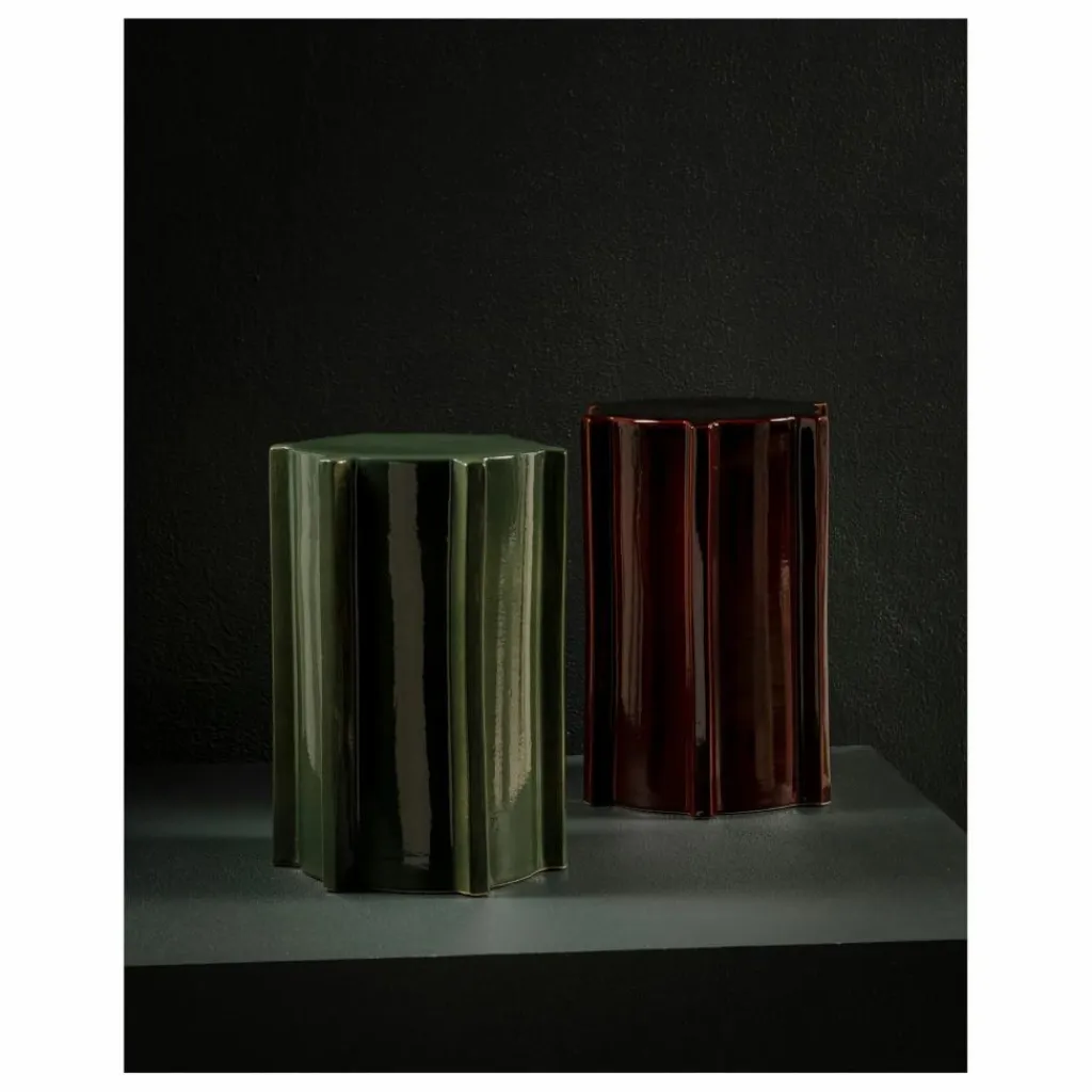Au fil des ans, les tabourets Pawn sont devenus des objets polyvalents déclinés dans des formes géométriques colorées et des matériaux variés. Depuis peu, la préférence de Marie s’oriente vers le grès émaillé, avec des couleurs riches et profondes en guise de touche finale. L’ajout de rainures horizontales ou verticales rend ces Pawn esthétiquement intéressants tout en offrant une prise pour déplacer facilement les tabourets.