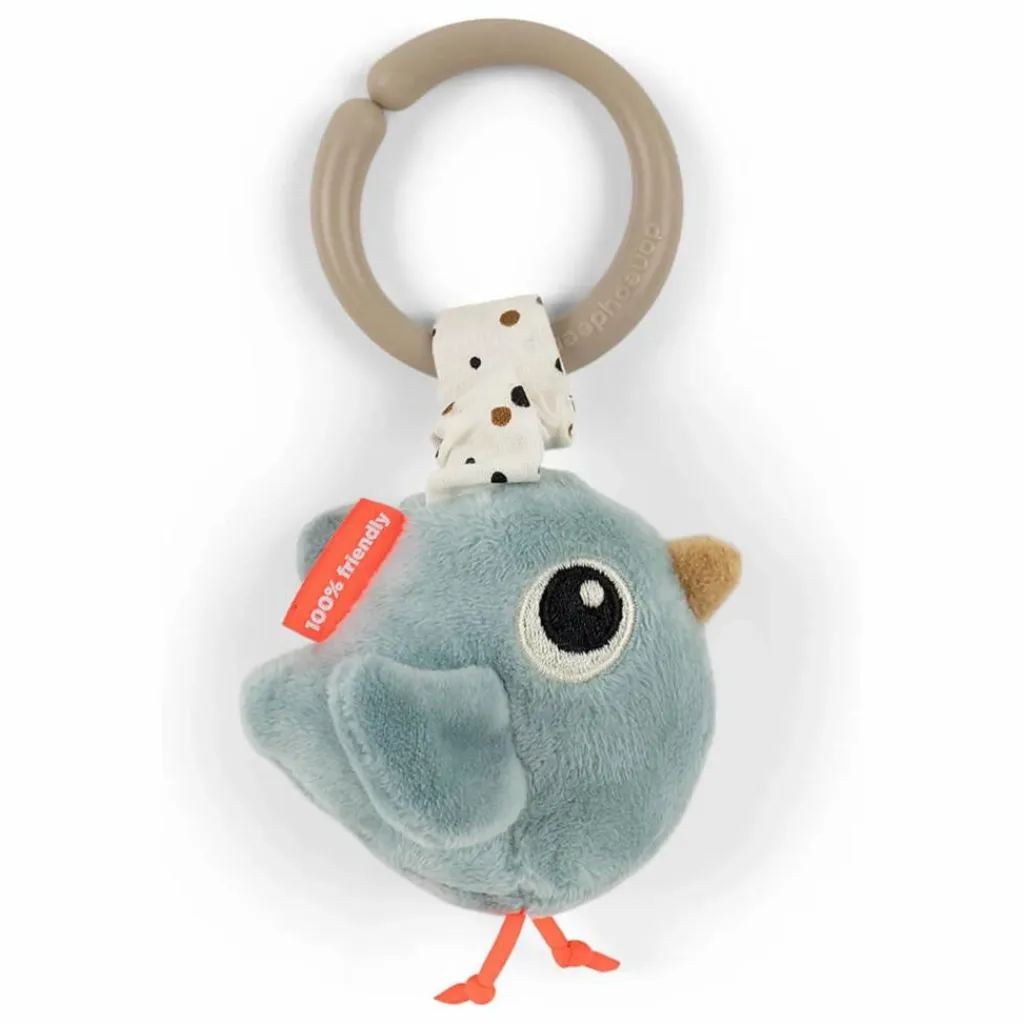 - • Bébé découvrira des éléments sensoriels comme un hochet, une clochette, du papier bruissant et un miroir pour stimuler son ouïe et son sens du toucher
