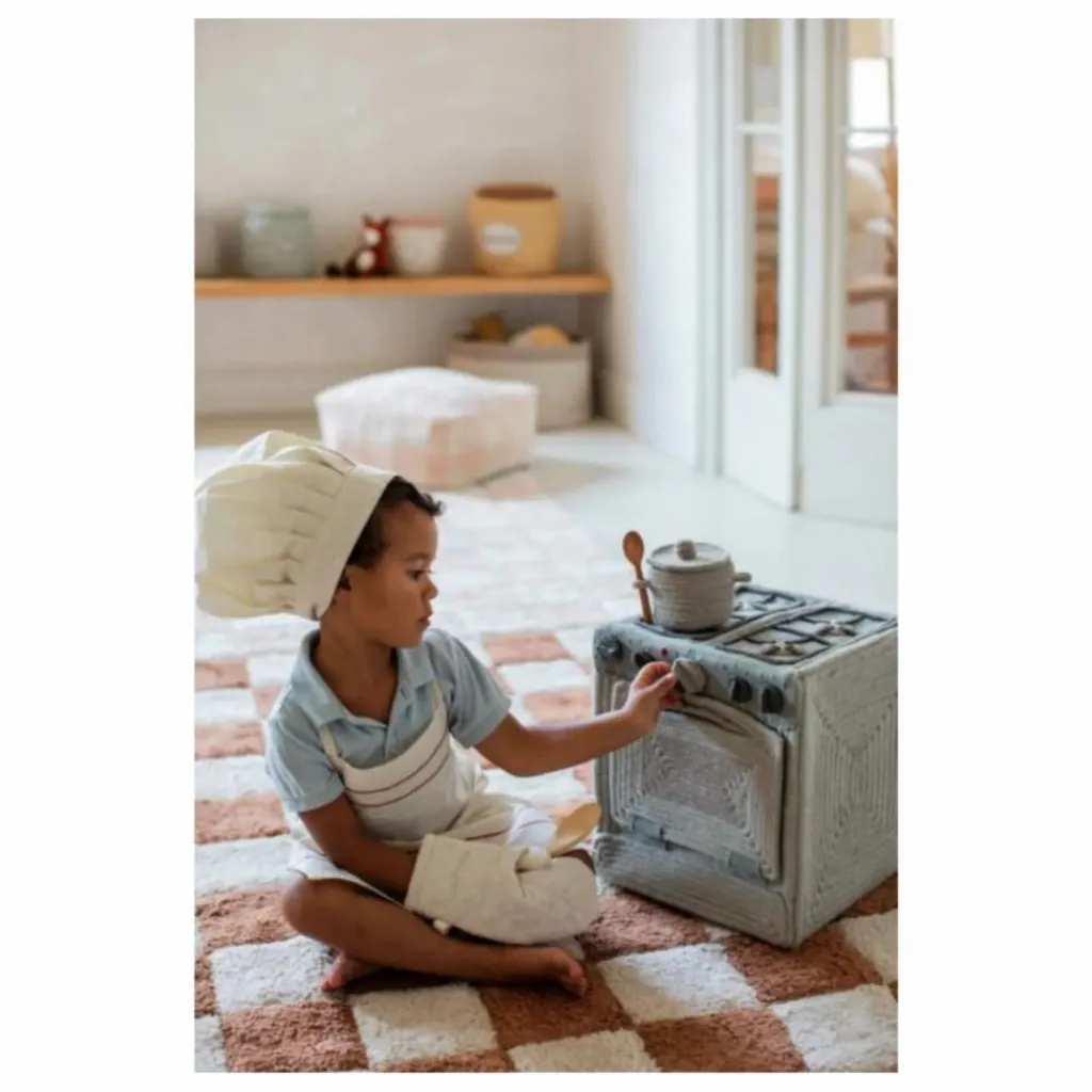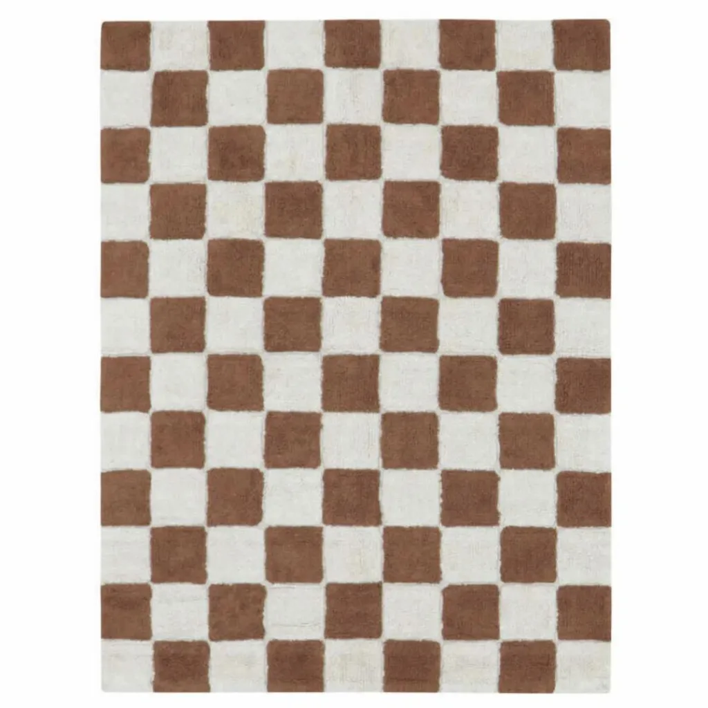 - Inspiré des sols en céramique vintage, le tapis Kitchen Tiles présente un motif à carreaux jouant avec des couleurs contrastées naturelles et caramel. Le tapis utilisait notre base en mélange RugCycled / toile naturelle, laissant la base légèrement visible entre les carrés colorés simulant les carreaux de la cuisine.