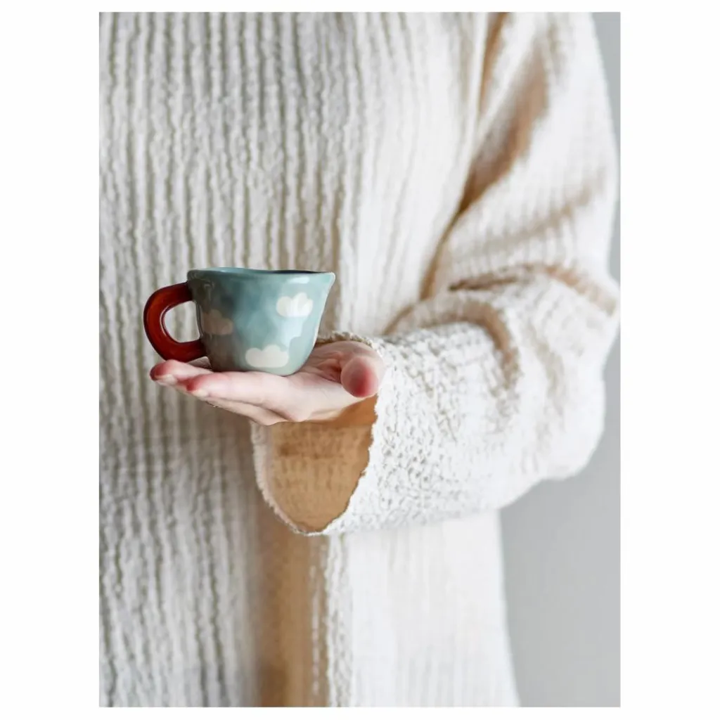 - La Tasse Nini de Bloomingville MINI est en grès, ce qui la rend parfaite pour servir du chocolat chaud aux petits ou un espresso aux adultes. La tasse est décorée de belles couleurs, et les nuages créent une ambiance rêveuse et féerique qui fait sourire, même les jours de pluie.