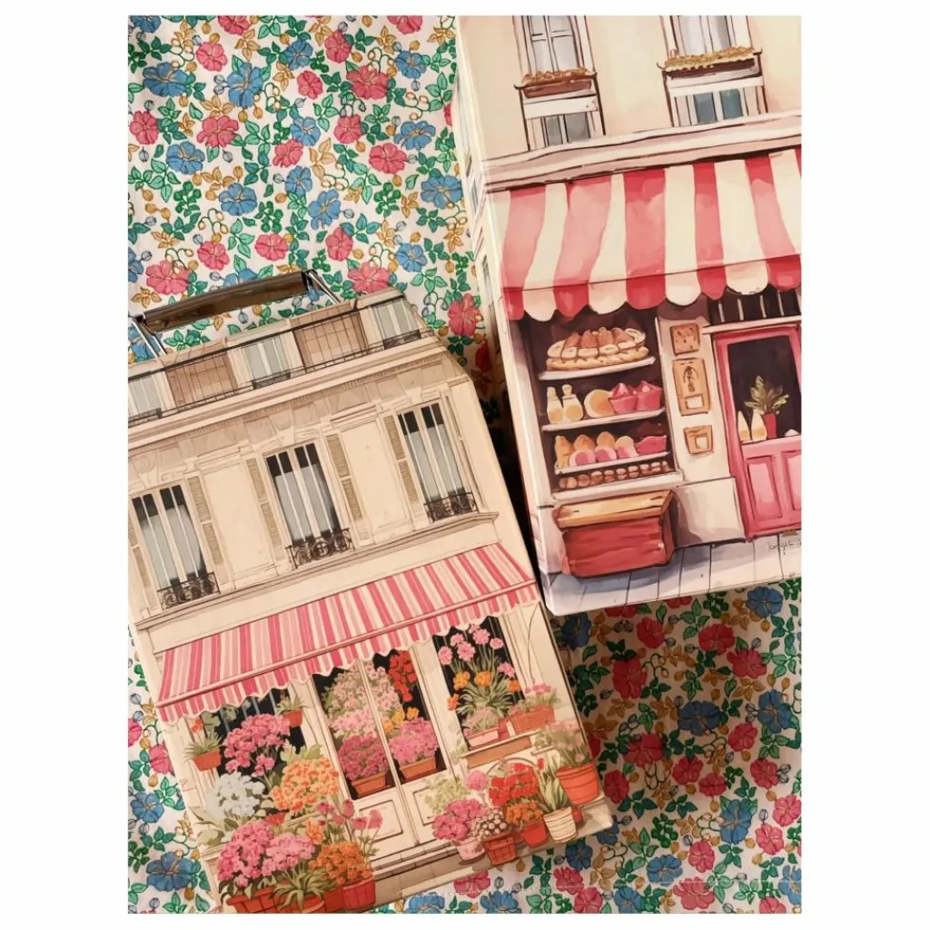 - Ensemble de deux boîtes de jeu en carton représentant des boutiques parisiennes d’époque. La petite valise s’insère dans la grande. Conçues avec des poignées en métal faciles à saisir. Entretien : Essuyer avec un chiffon humide (max 30 degrés C). Ne pas utiliser de produits chimiques. Matériaux : Carton et métal.