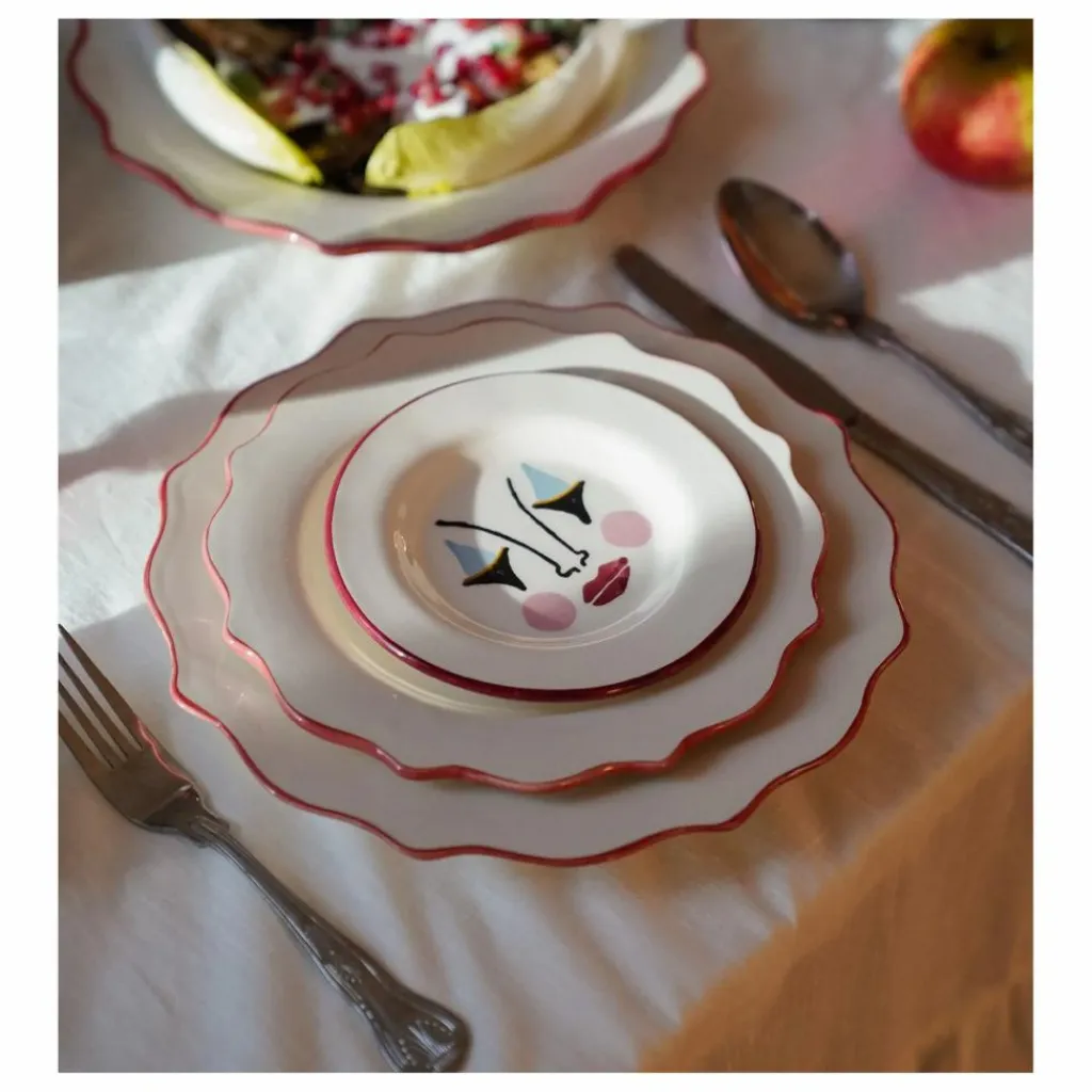 - L’assiette à déjeuner festonnée Carmine présente un design amusant et vibrant qui égaie sans effort votre table. L’adorable bande rouge peinte à la main autour du cercle extérieur des assiettes sculptées rend l’objet mignon et extraordinaire. Combinez-la avec les autres assiettes pour obtenir une table colorée.