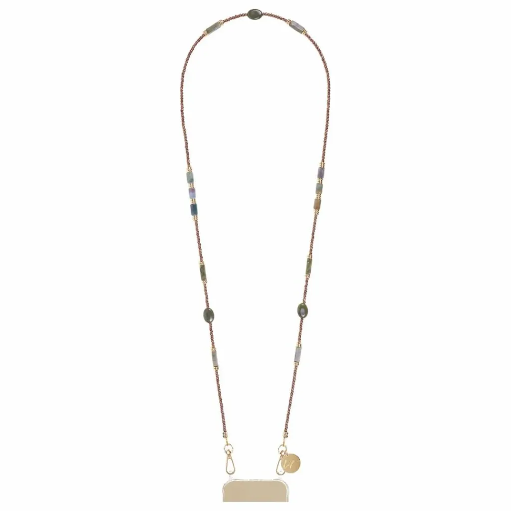 - Notre chaîne de téléphone Iliana, en perles en verre bronze, oeil de chat, pampilles dorées à l’or fin, longue de 120 cm, se clipse sur nos coques à anneaux ou notre adaptateur avec ses mousquetons dorés.