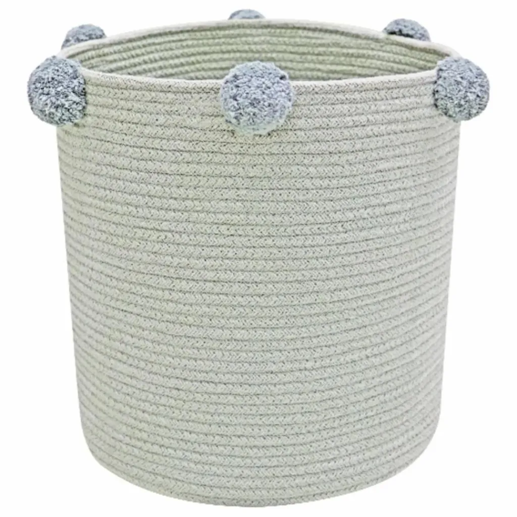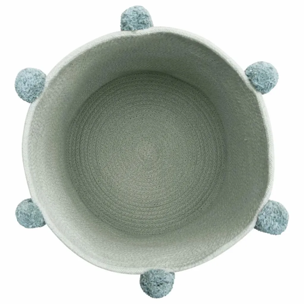 - Panier en cordon de coton tressé de couleur bleu sauge et fini avec 6 pompons en coton bleu vintage