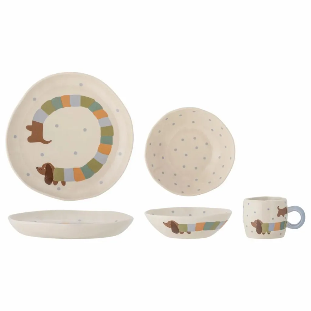 - Le Charlie Ensemble de Vaisselle de Bloomingville MINI apporte de la joie à la table avec son design ludique et coloré. L’ensemble comprend une tasse, un bol et une assiette, tous décorés d’un motif de chien mignon et de petits points dans des teintes douces. Il est parfait pour un usage quotidien et apportera sans aucun doute des sourires tant chez les enfants que chez les adultes. Le service de vaisselle est en grès.