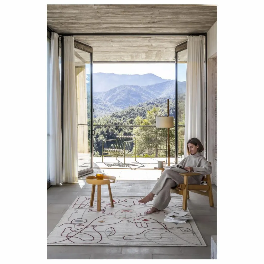 Représentée par un trait délicat, l’illustration définit les silhouettes de plusieurs personnages imaginaires qui se mêlent et s’entremêlent. Jaime Hayon introduit subtilement la couleur à travers de petits éléments débordants de personnalité, qui aident à interpréter chacune des images. Le tapis se regarde de n’importe quelle perspective par ses neuf faces réparties sous différents angles, il s’intégrera parfaitement dans n’importe quel espace. Pour la première fois la broderie est apposée sur un kilim, un processus laborieux fait à la main.
