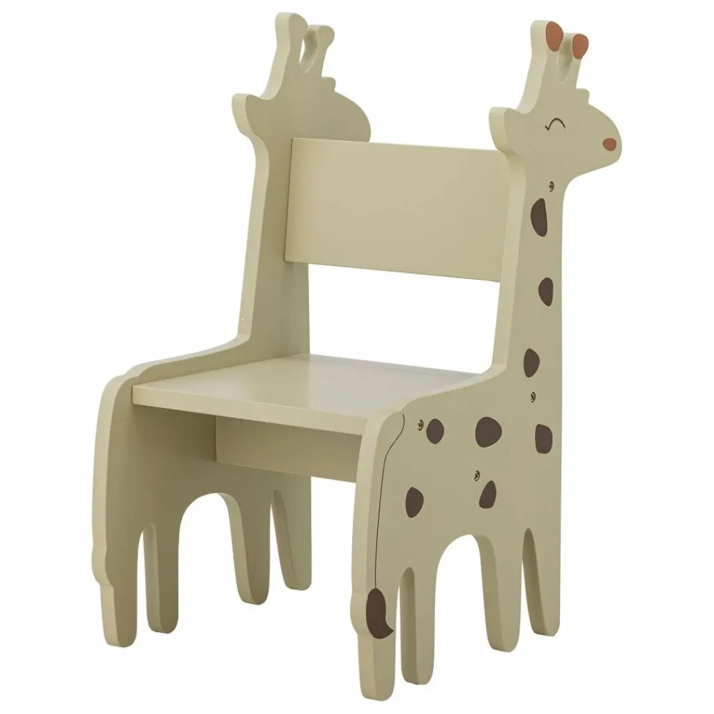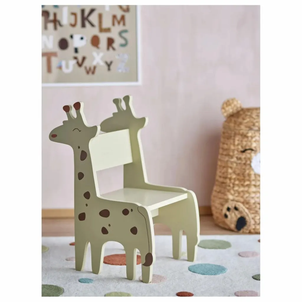 - La Chaise Ibber de Bloomingville MINI est une chaise charmante en forme de girafe. Fabriquée en MDF certifié FSC, elle constitue un ajout parfait à toute chambre d’enfant. Avec son adorable design de girafe dans des tons verts, elle apporte une atmosphère ludique et vivante tout en offrant un siège confortable pour les plus petits.