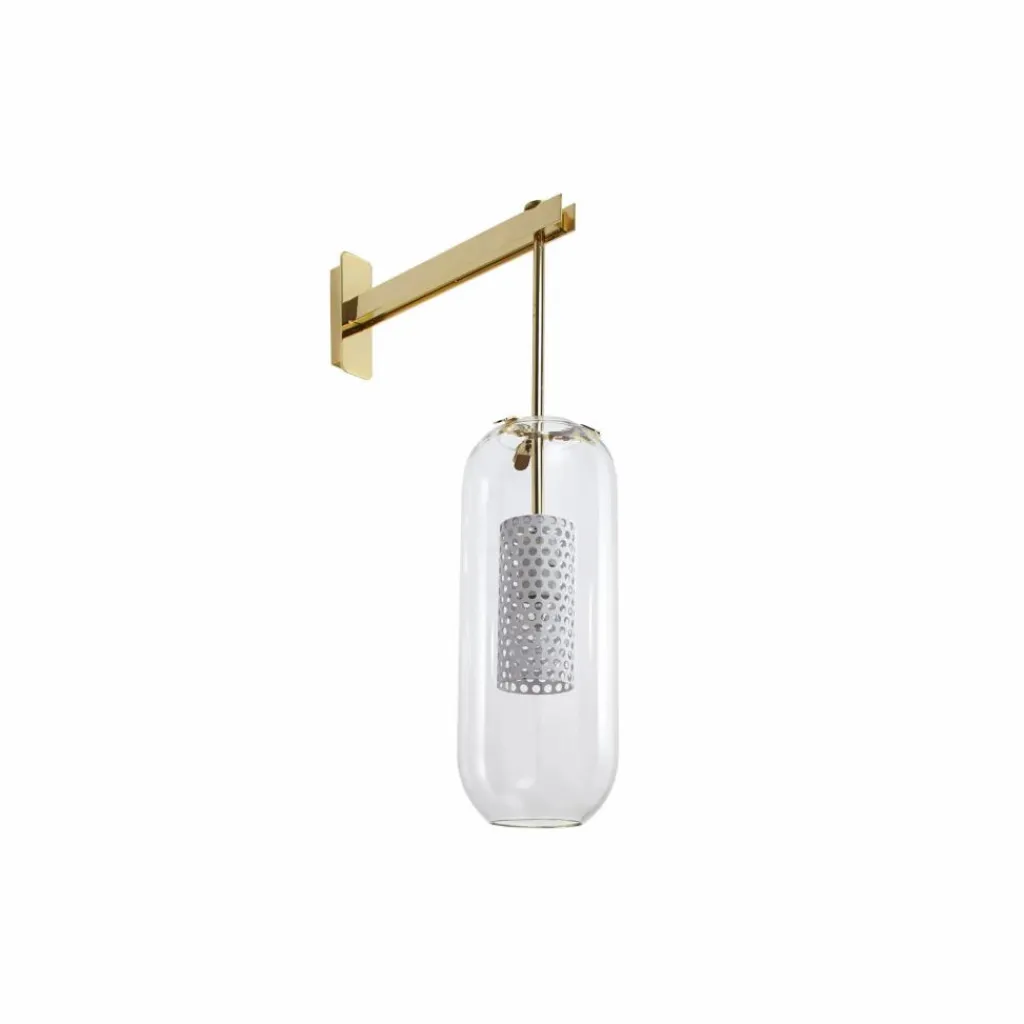 Arboré d’une élégante bulle de verre, le contraste opère avec la finesse de sa tige en acier. Cette applique diffuse une lumière douce et projette des reflets graphiques sur les murs.