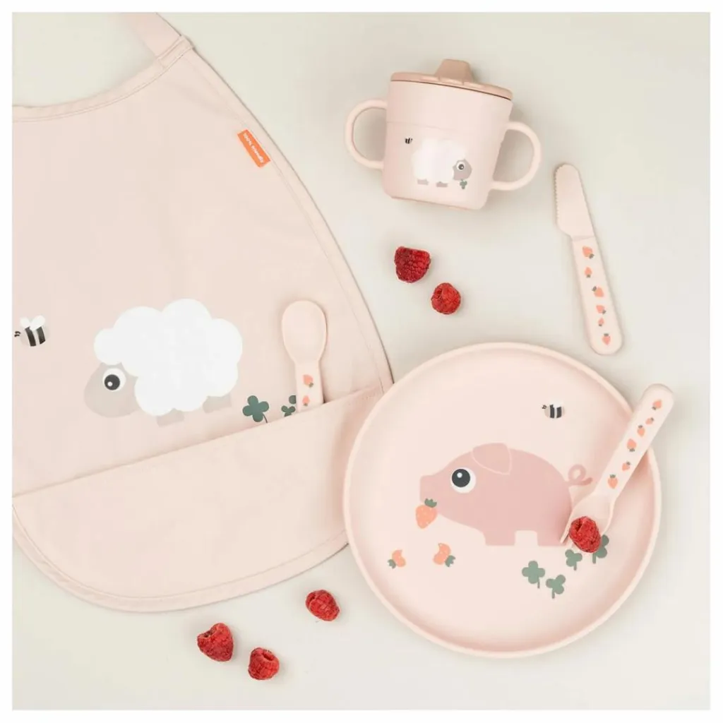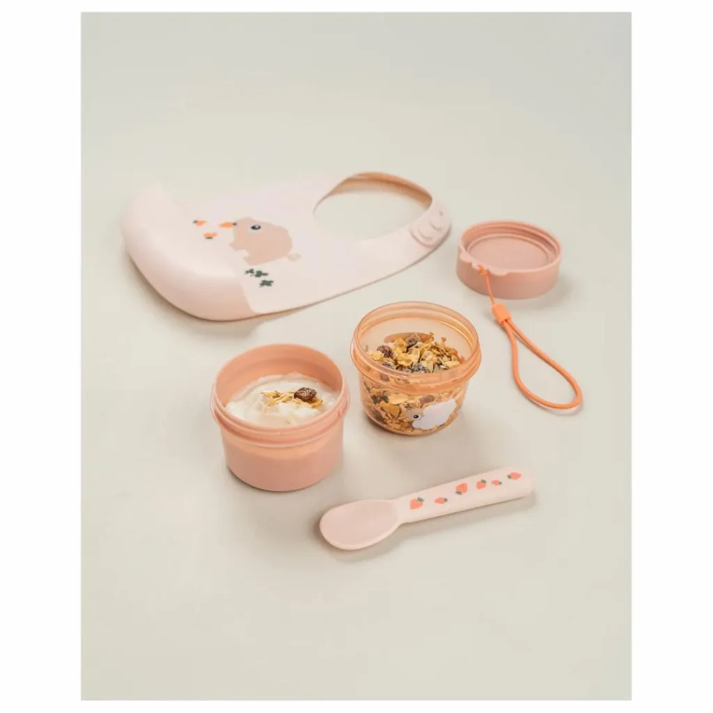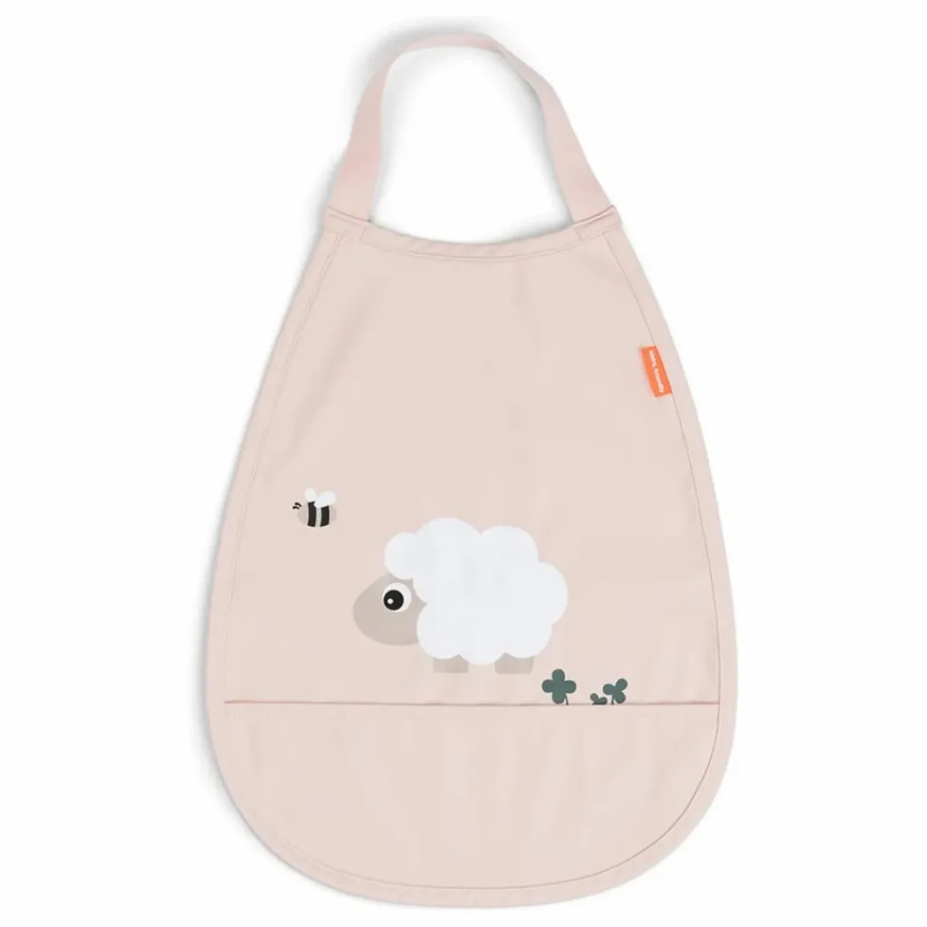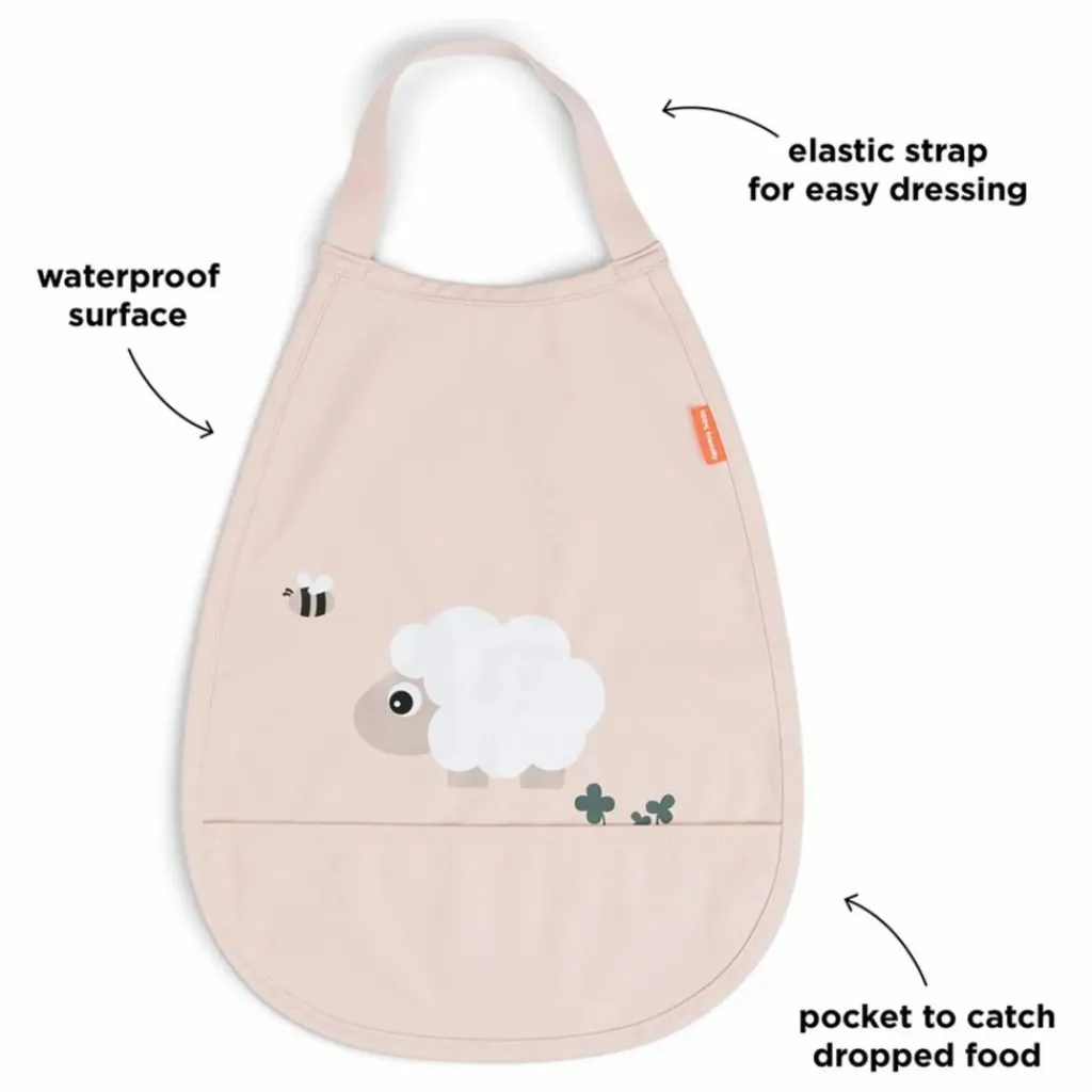 - • Le bavoir à enfiler par la tête a une pochette pour récupérer les aliments tombés à côté