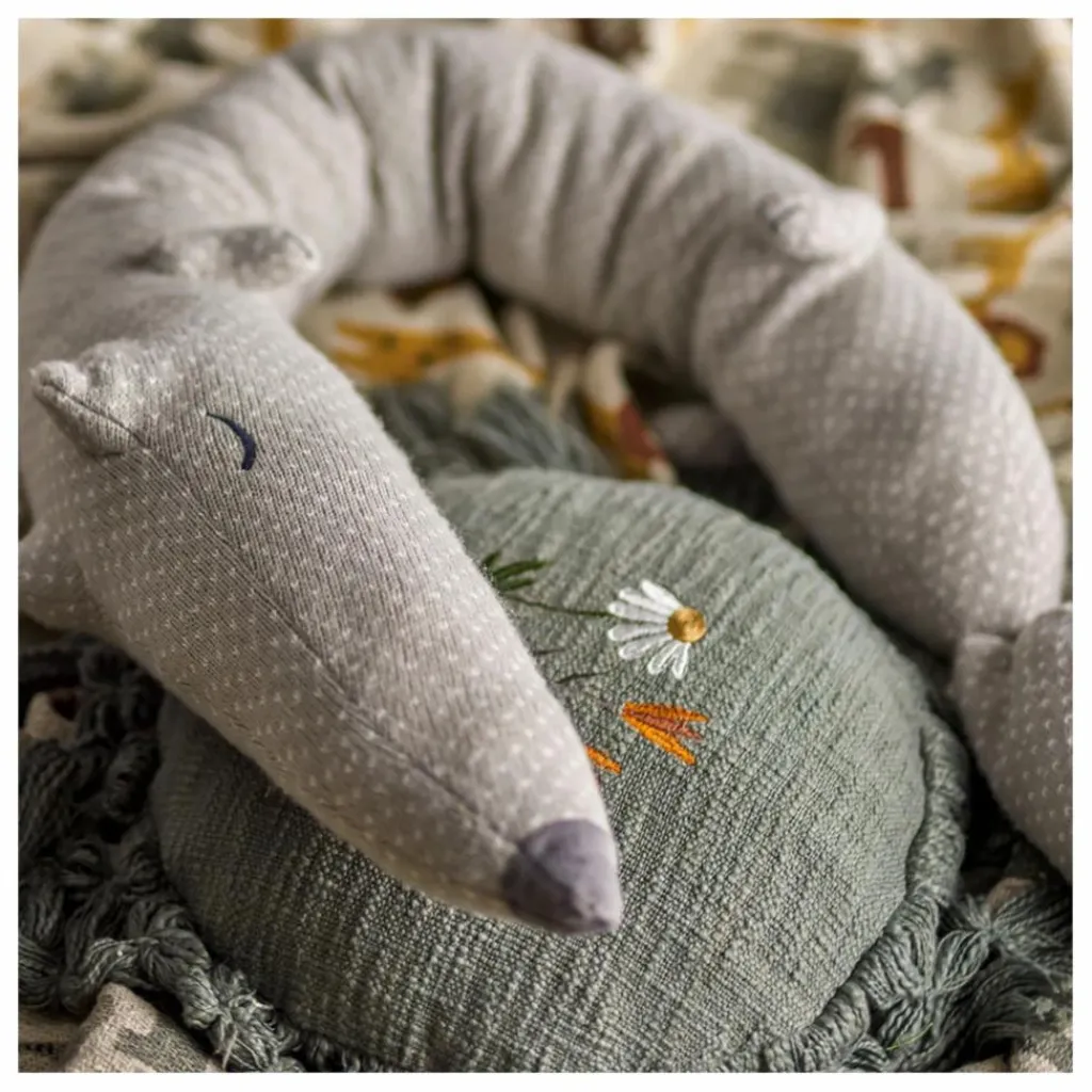 - Le Coussin Elinna de Bloomingville MINI est de forme ronde et bordé de grands glands tout autour. Il est d’une jolie couleur grise avec des fleurs au milieu. Le Coussin est en coton recyclé et s’intègre parfaitement dans une chambre d’enfant ou une serre.