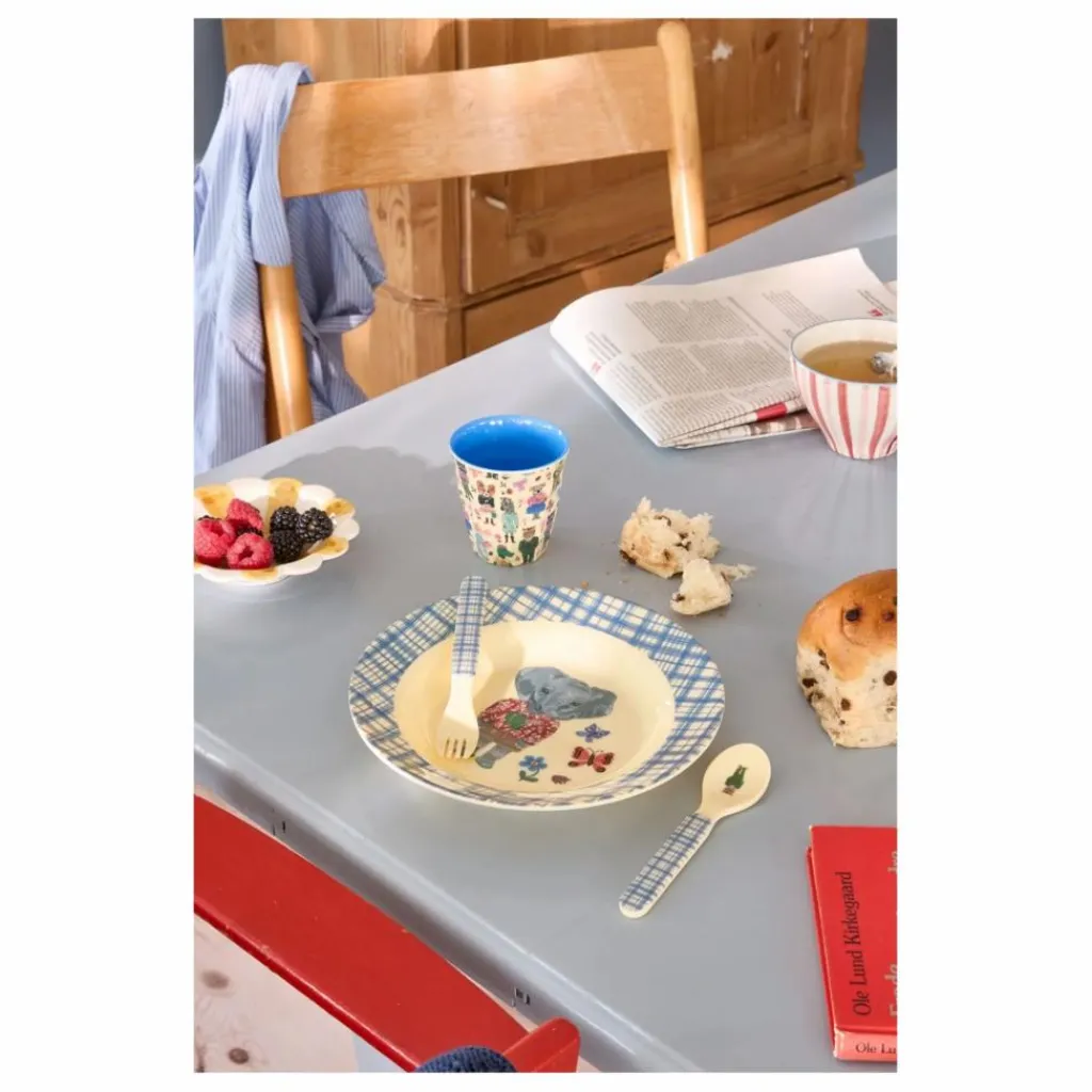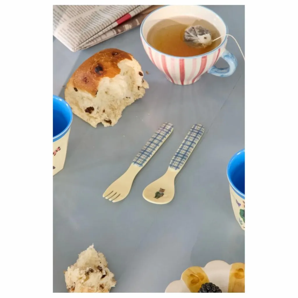 - Cuillère et fourchette en mélamine pour enfants avec imprimé Nathalie Lété – Bleu