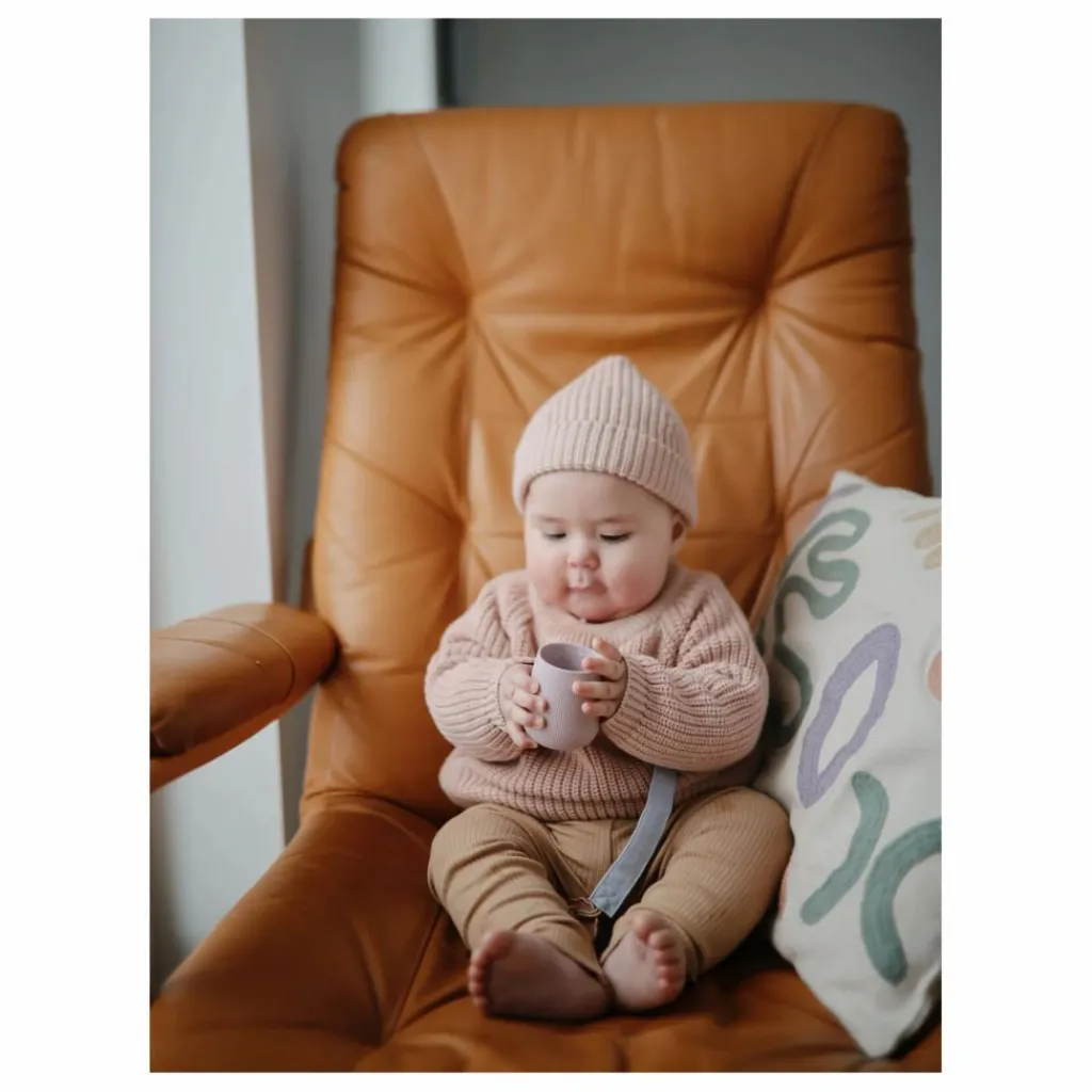 - Le gobelet Mushie’s Starter Cup est doté d’un revêtement extérieur strié qui offre une prise antidérapante et d’une base lestée qui l’empêche de basculer.