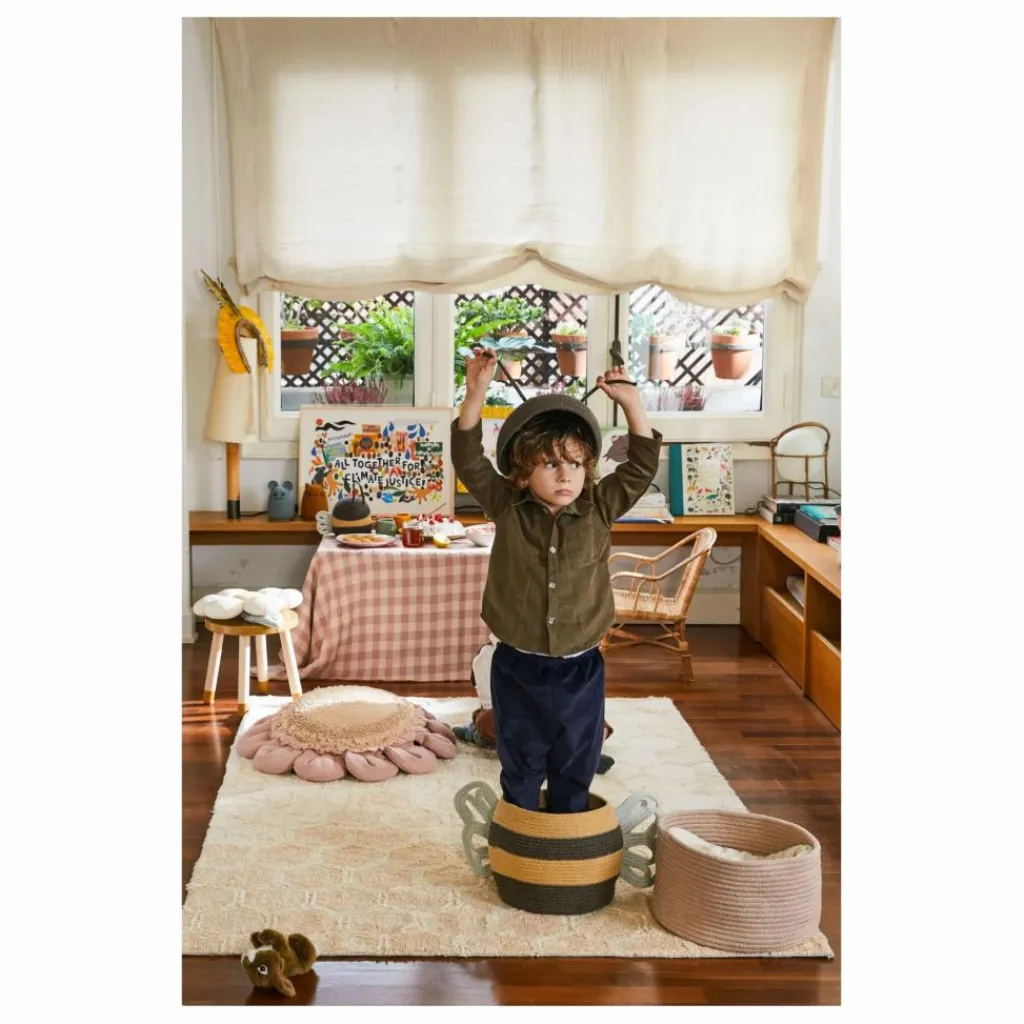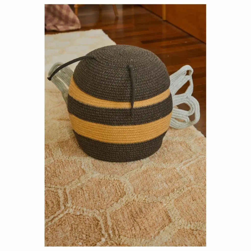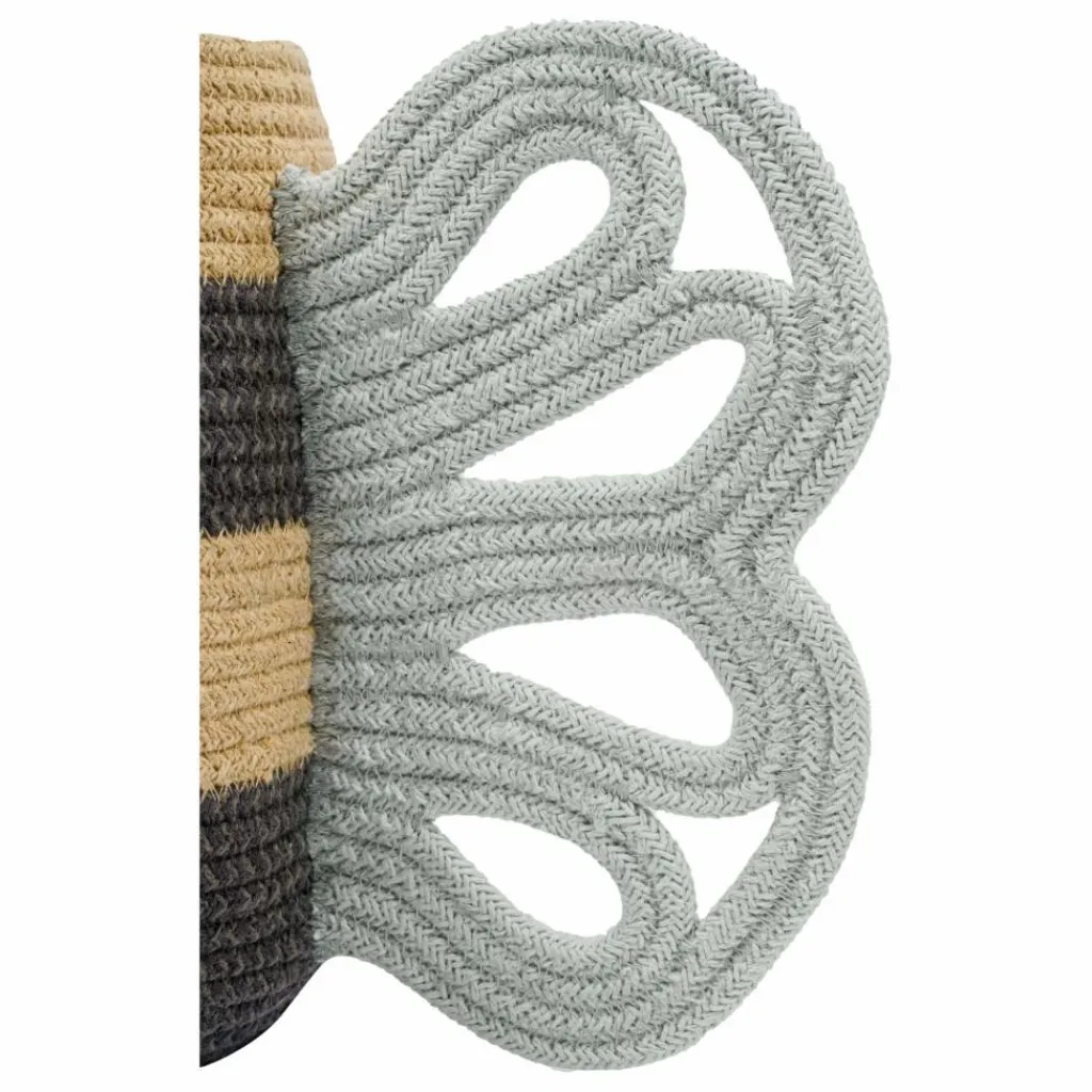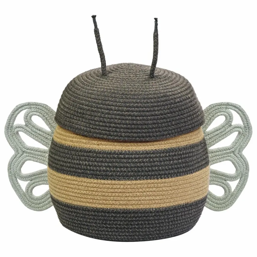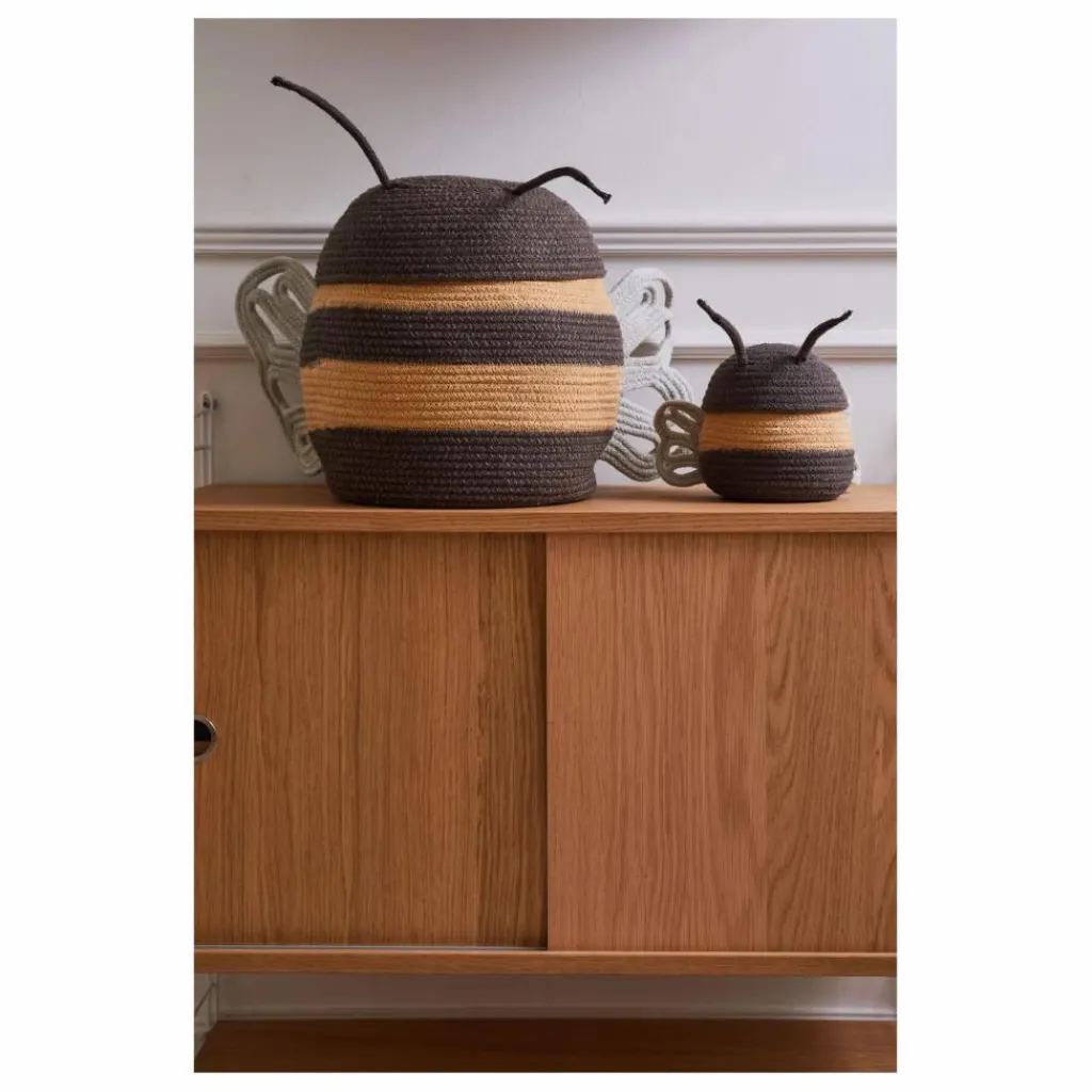- Le panier Mama Bee est fabriqué à la main à partir de cordons tressés de bouteilles en PET recyclé recouverts de fils de coton, combinant des rangées de miel avec des cordons gris foncé mélangés. Avec deux cordons ajoutés en guise d’antennes et des ailes aux formes délicates de couleur bleu clair, le panier Mama Bee aidera à garder les jouets et les petits trésors organisés.