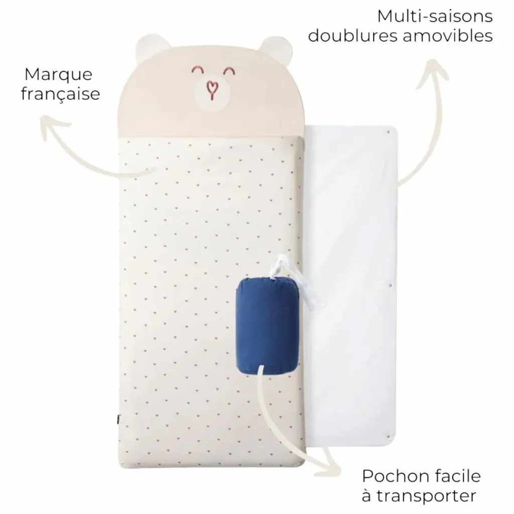 Le sac de couchage 4 saisons, unique et adaptable, convient aux enfants de 3 à 6 ans et s’ajuste à toutes les saisons grâce à sa doublure amovible (TOG 3 avec, TOG 1 sans), facilement retirable via une fermeture zippée discrète. Idéal pour la transition entre la gigoteuse et le « lit de grand », il assure que votre enfant reste bien couvert. Parfait pour les siestes à la maternelle, il est léger, transportable dans son pochon, et utilisable toute l’année. Pratique pour les vacances ou pour recevoir un copain, il devient vite indispensable.