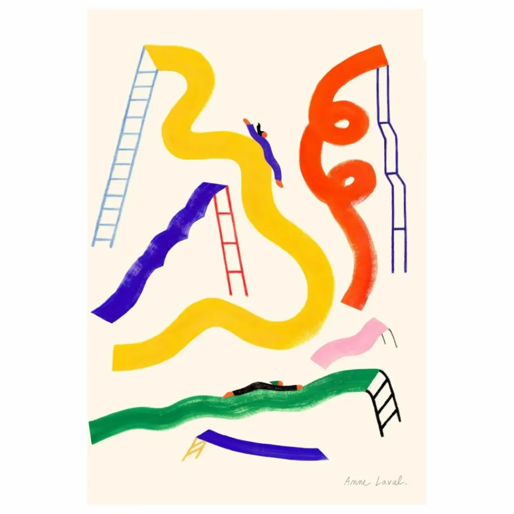 Glisser, de l’artiste française Anne Laval, célèbre le plaisir simple de la glissade. Tournante, ondulée, bosselée ou droite, chaque pente offre une nouvelle aventure. Créée à partir d’un mélange de formes estampées à la main en gouache et de traits au pastel, la composition vous entraîne dans un monde de pur bonheur !