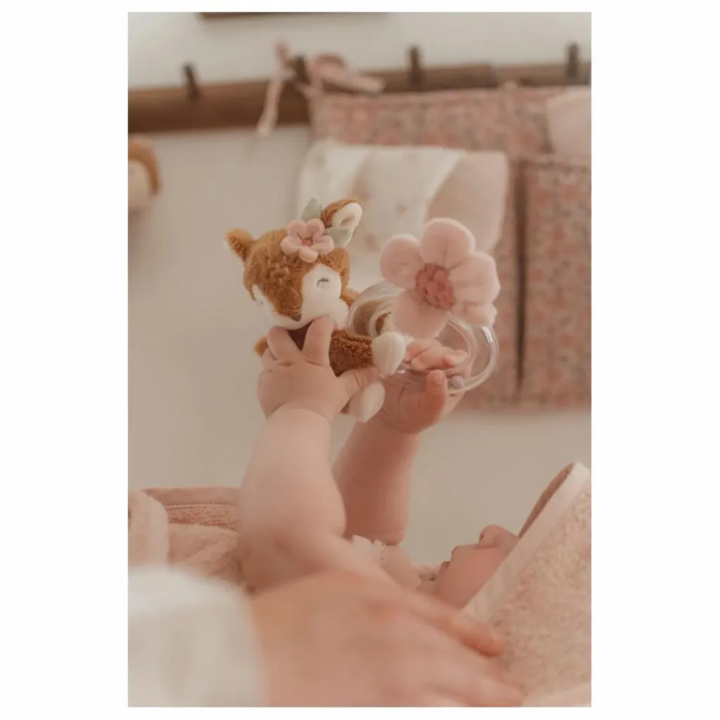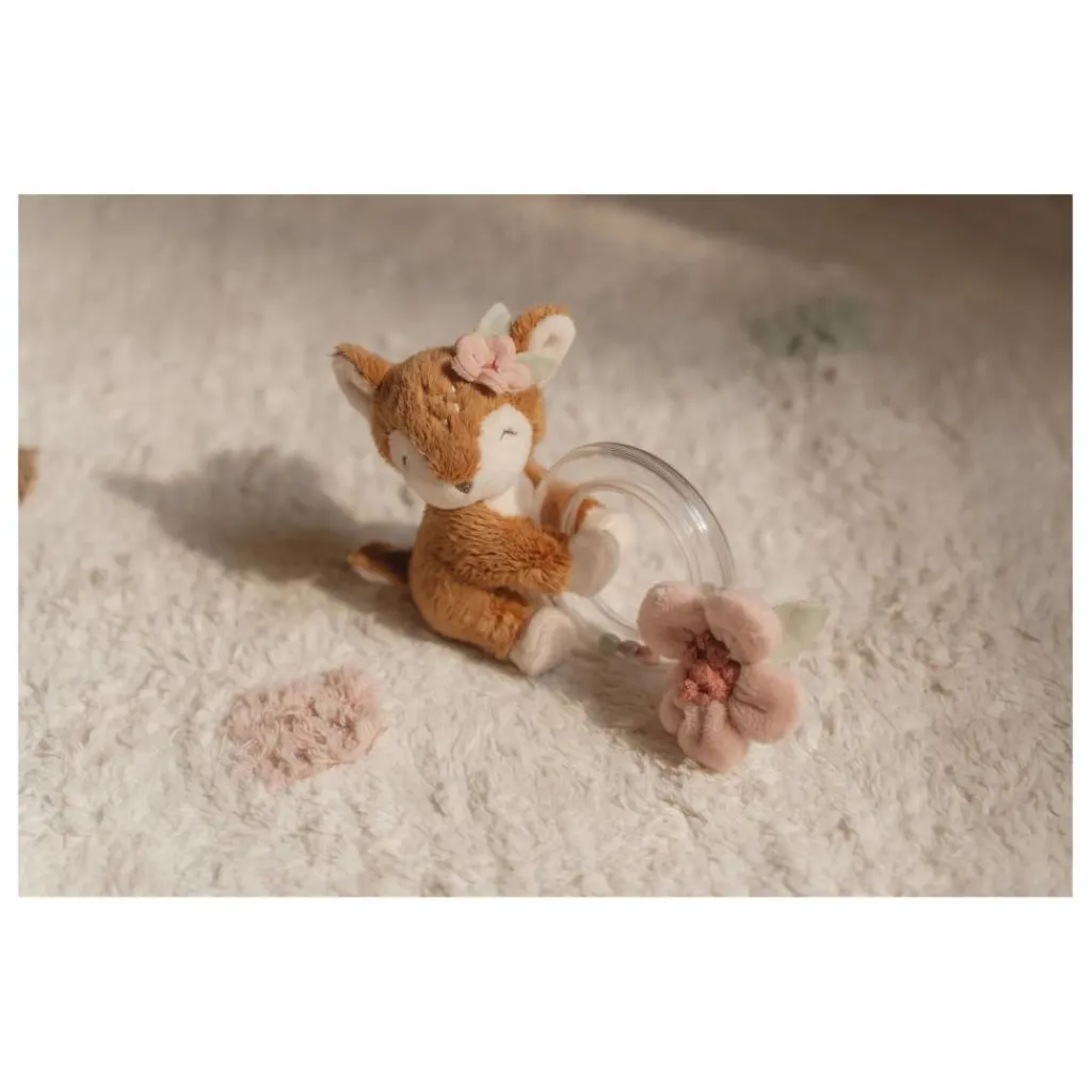 - Cet adorable faon, avec sa fourrure douce et sa petite fleur à caliner, stimulera l’éveil des sens de votre bébé. L’anneau transparent contient 3 petites perles colorées qui produisent un doux cliquetis pour stimuler l’ouïe de votre enfant. Ce hochet faon éveillera la curiosité et les sens de votre bébé, tout en favorisant sa coordination main-œil.