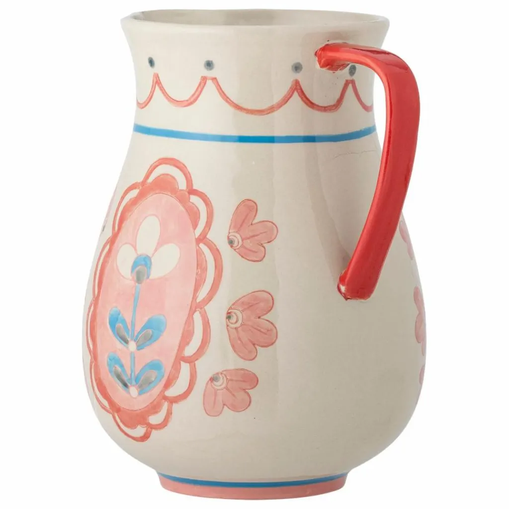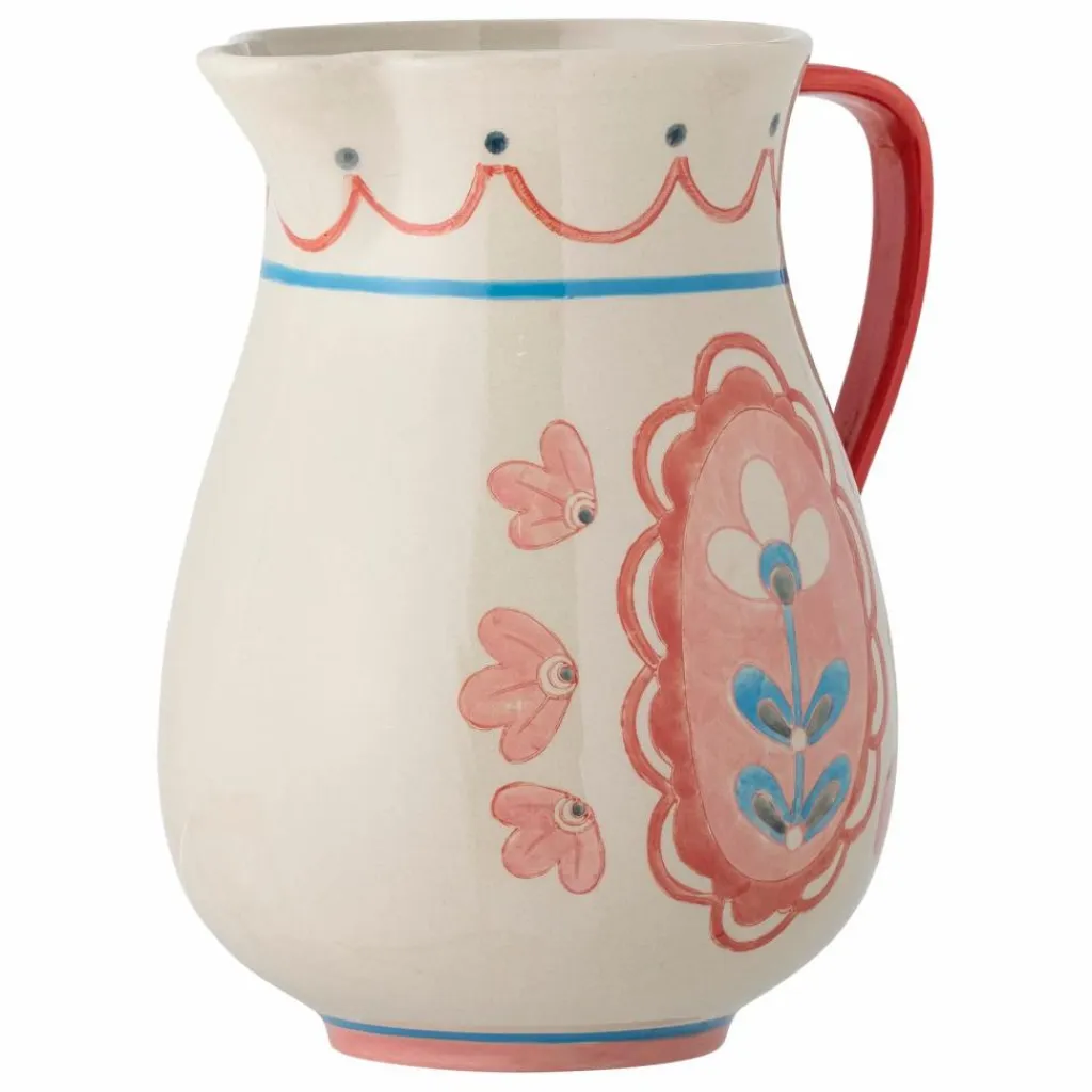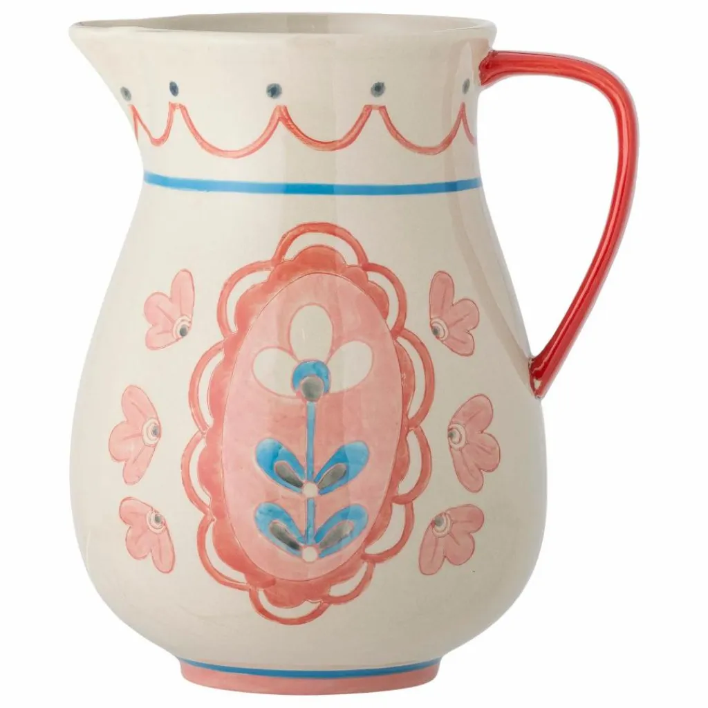 - La Pichet Odina de Bloomingville présente un fond neutre qui met élégamment en valeur le motif floral charmant dans des nuances de rose et bleu. La poignée dans une nuance rose profonde offre un contraste frappant, enrichissant l’apparence douce de la carafe avec un twist moderne qui complète son esthétique nostalgique.