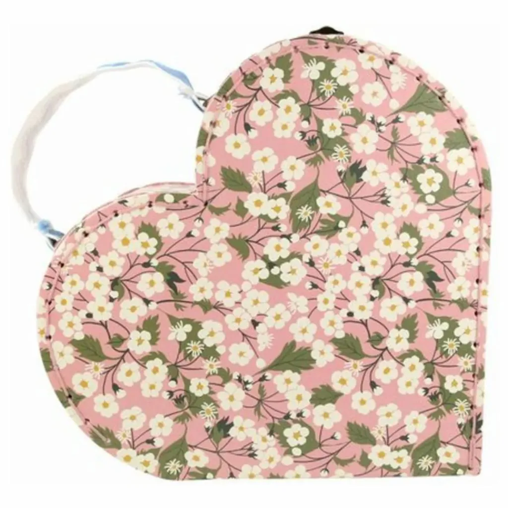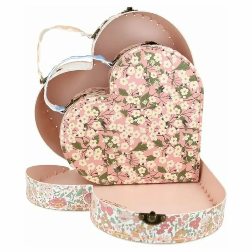 - Deux valises en forme de cœur de tailles différentes en carton cousu avec plastification. Le plus petit étui peut être rangé à l’intérieur du plus grand. Chaque valise présente un motif floral Liberty différent, avec des tons roses, à l’extérieur.. Poignées en sangle de coton naturel