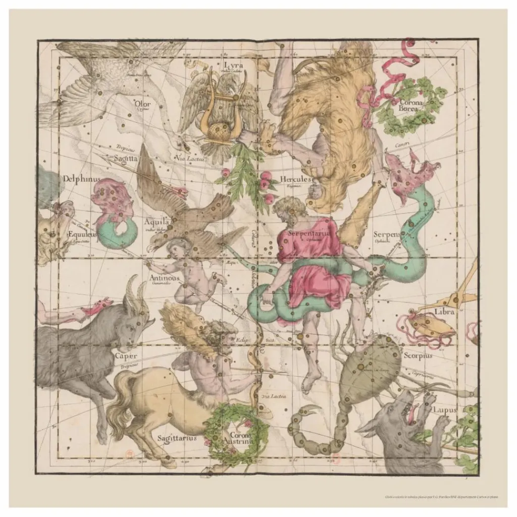 Cette planche du Zodiaque fait partie d’un ensemble de 6 planches – Globi coelestis in tabulas planas par Ignace-Gaston Pardies (1636-1673), cartographe. Composez votre propre Zodiaque avec vos constellations et signes préférés. A accumuler avec une ou plusieurs planches du même ensemble (jusqu’à 6 cartes composant l’ensemble du Zodiaque) ou à encadrer seul.