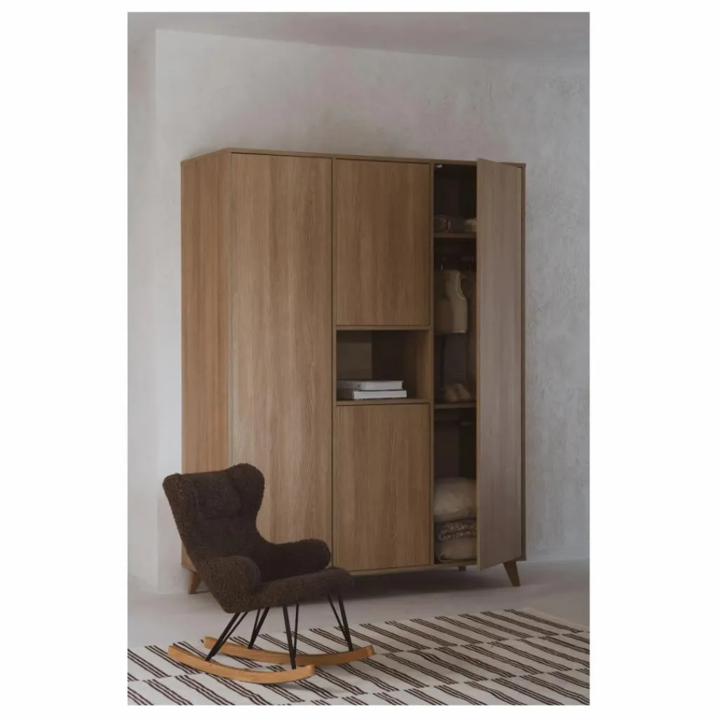 Les trois portes pivotantes de l’armoire s’ouvrent facilement d’un simple poussé, grâce au système intégré d’ouverture push-to-open, garantissant à la fois fonctionnalité et attrait esthétique. À l’intérieur, elle dispose de six étagères ajustables et de deux tringles à vêtements, offrant ainsi de nombreuses options de rangement et d’organisation pour les essentiels de votre bébé.