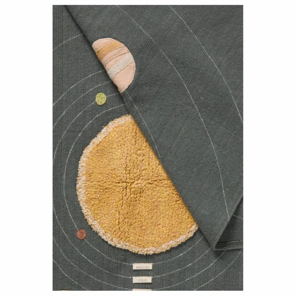 En son centre se trouve un soleil jaune touffeté, entouré d’orbites et de planètes cousues dans un spectre de couleurs. Chaque planète est fabriquée de manière unique à l’aide de techniques telles que la couture au fil, le tufting et la fabrication artisanale minutieuse de planètes plus grandes à l’aide de différentes bases de toile, de cordons et de broderies au fil.