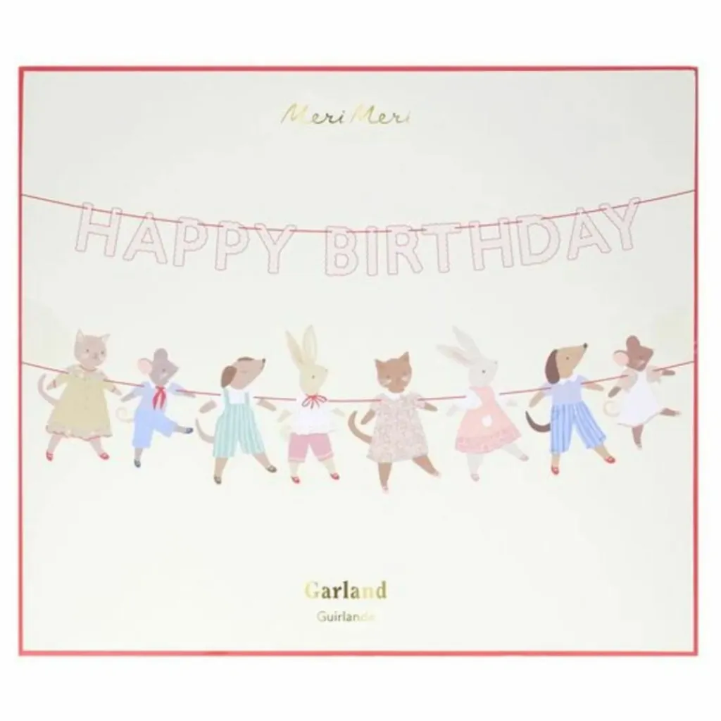 - Cette guirlande est répartie sur 2 cordes. Une chaîne porte l’expression « Joyeux anniversaire » écrite en fanions crème et rouges.. La deuxième chaîne présente un défilé d’adorables fanions d’animaux, avec des motifs sur le devant et le dos.
