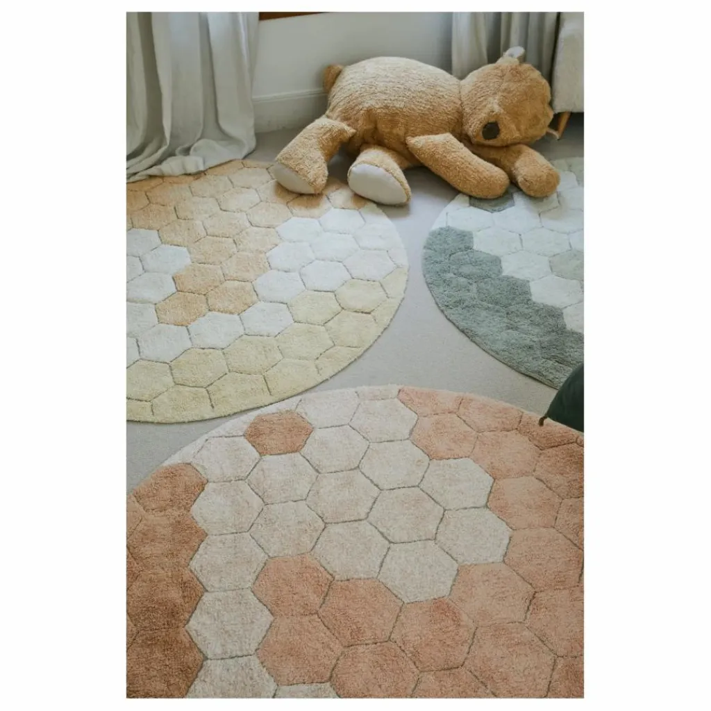 - Inspiré du motif géométrique en nid d’abeille, le tapis Round Honeycomb Rose est composé de douces pièces de couleurs hexagonales touffetées dans les tons ivoire, rose clair et rose. La toile de base est légèrement visible entre les taches de couleur, donnant une surface structurée au tapis.