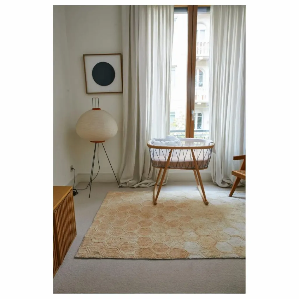 - Un tapis rectangulaire en coton aux nuances de couleurs douces, inspiré du panneau naturel en nid d’abeille créé par les abeilles. En utilisant des fils de couleurs mélangées, des nuances de couleurs subtiles sont créées avec un effet légèrement ombré allant de l’ivoire au doré, et le motif hexagonal est touffeté en jouant avec différentes hauteurs de poils pour obtenir une texture riche.
