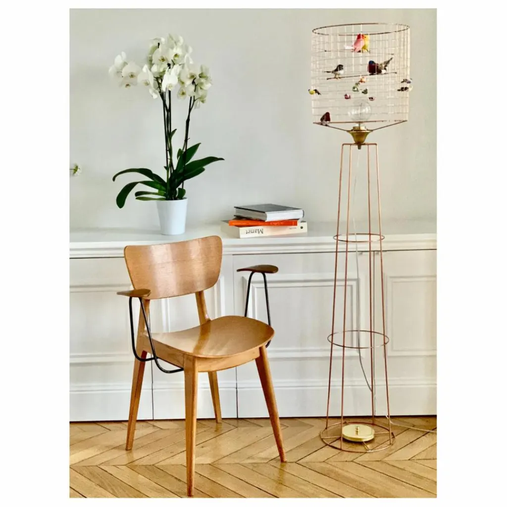 Poétique et moderne, le lampadaire volière donne vie à de faux oiseaux plus vrais que nature, dans un superbe abat-jour en grillage cuivré. À la fois aérienne, baroque et contemporaine, chaque pièce dessinée et crée par l’artiste est empreint d’une incroyable douceur et dégage une véritable élégance. Designer exigeant, Mathieu Challières imagine des luminaires joyeux et uniques en leur genre, devenus au fil du temps de véritables icônes du design. Faits-main en France, ces créations incontournables se déclinent en suspension, lampe à poser ou lampadaire.