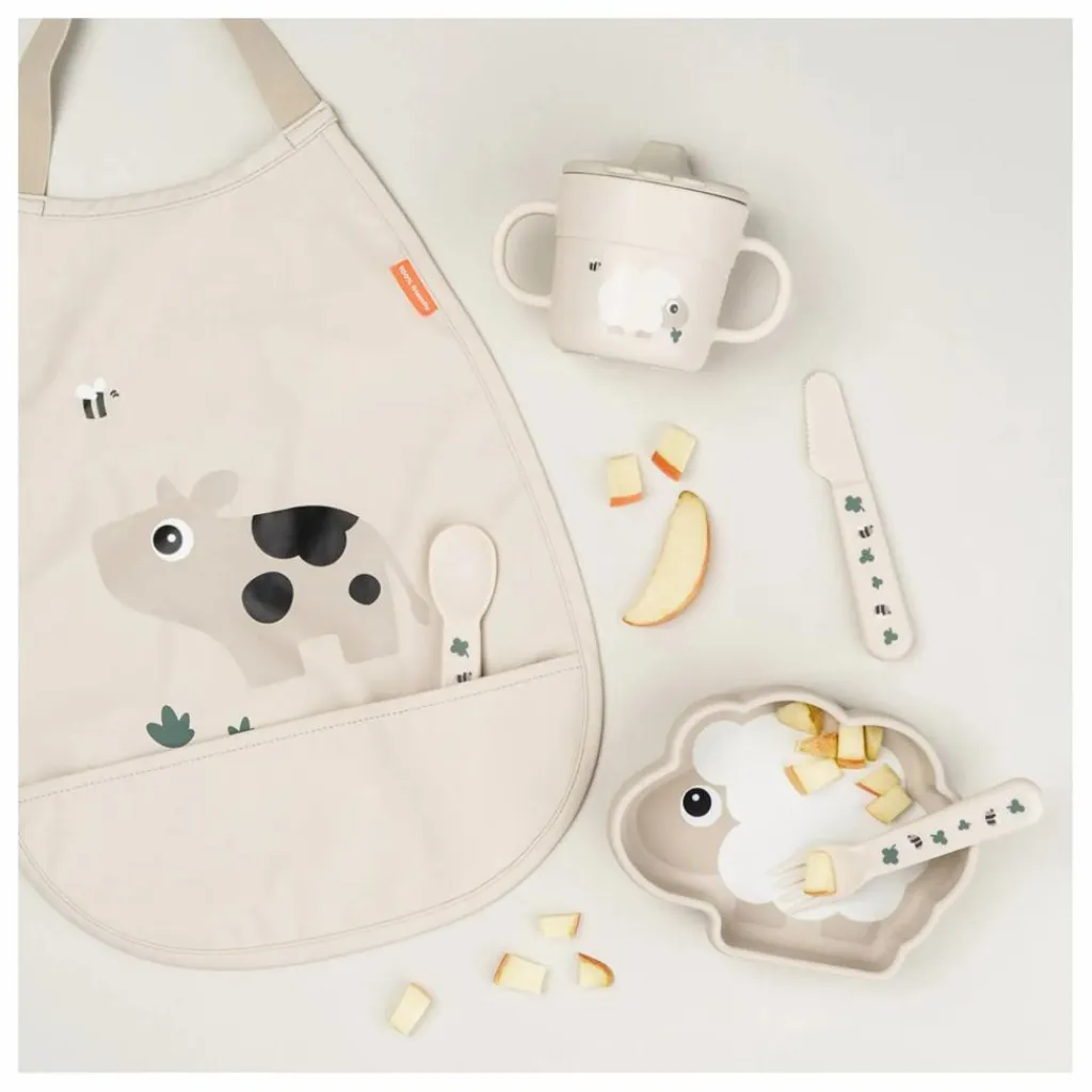 - • Le bavoir à enfiler par la tête a une pochette pour récupérer les aliments tombés à côté