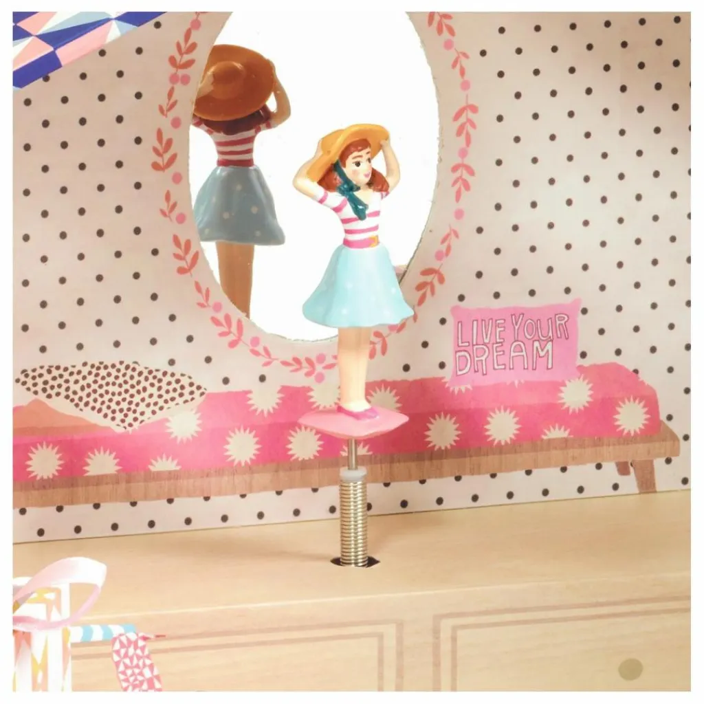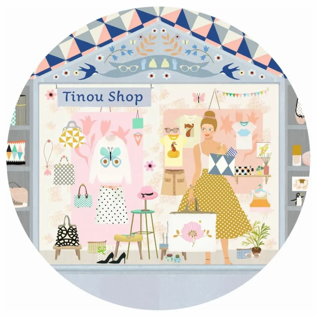 - Tinou Shop est une boîte à musique joliment illustrée avec trois tiroirs pour ranger ses bijoux et secrets. Tournez la manivelle, ouvrez les portes de ce joli magasin, et surprise ! Une fillette finement sculptée tourne et se reflète sur un miroir silhouetté au son de la musique « La flûte enchantée » de Wolfgang Amadeus Mozart.