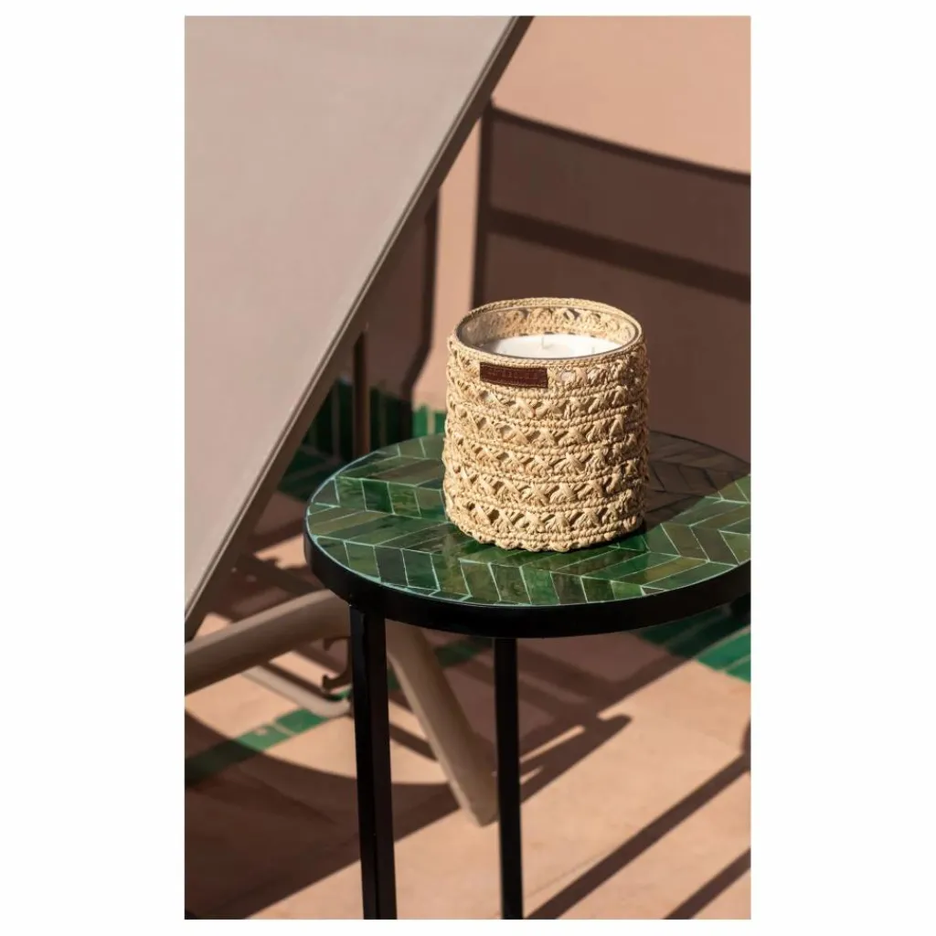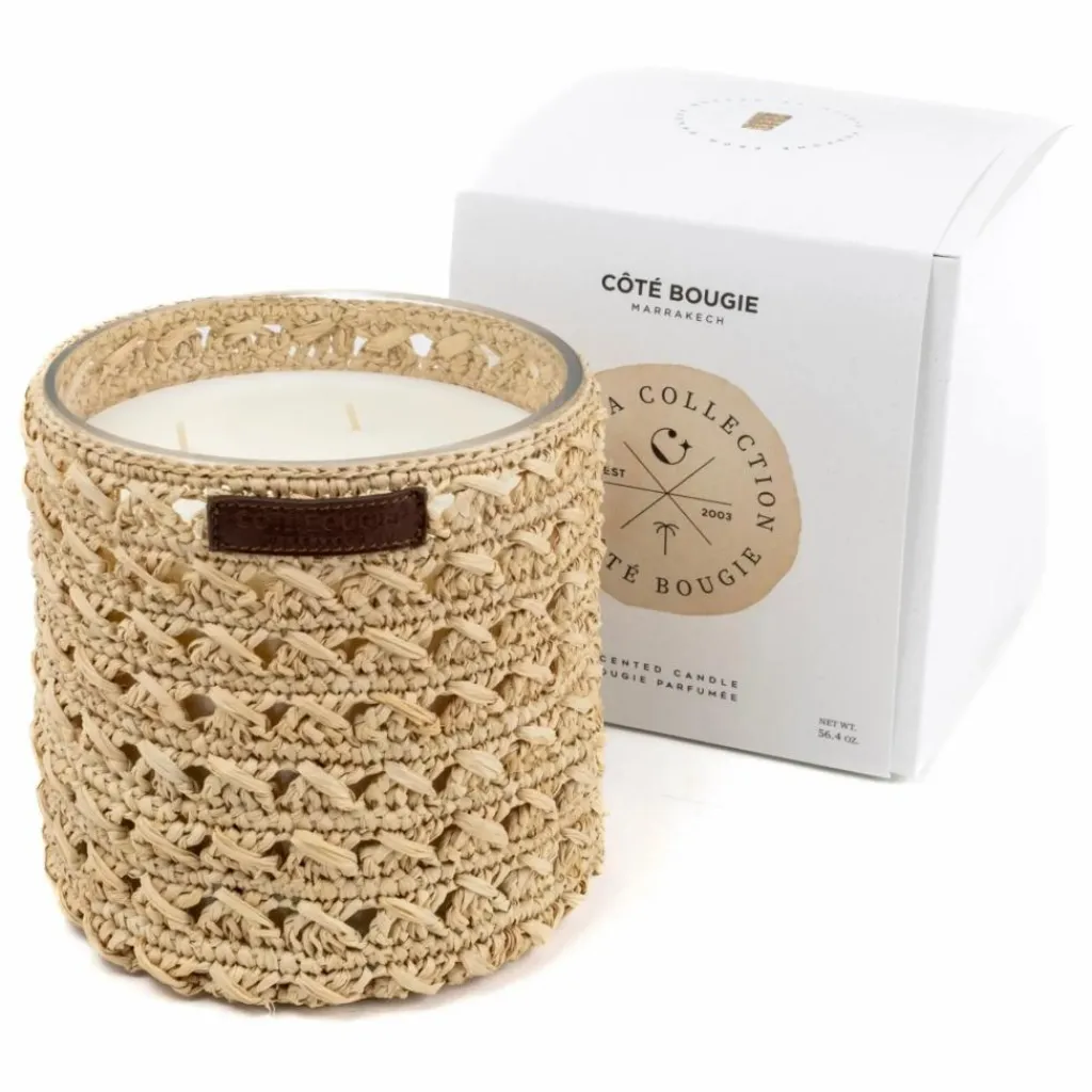 - Bougie parfumée habillée de raphia tressé à la main par une coopérative de femmes à Essaouira.