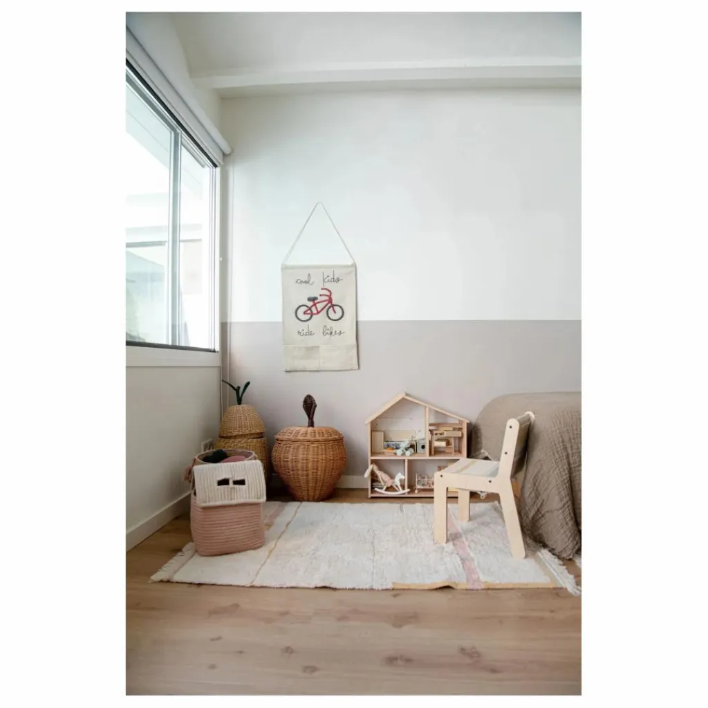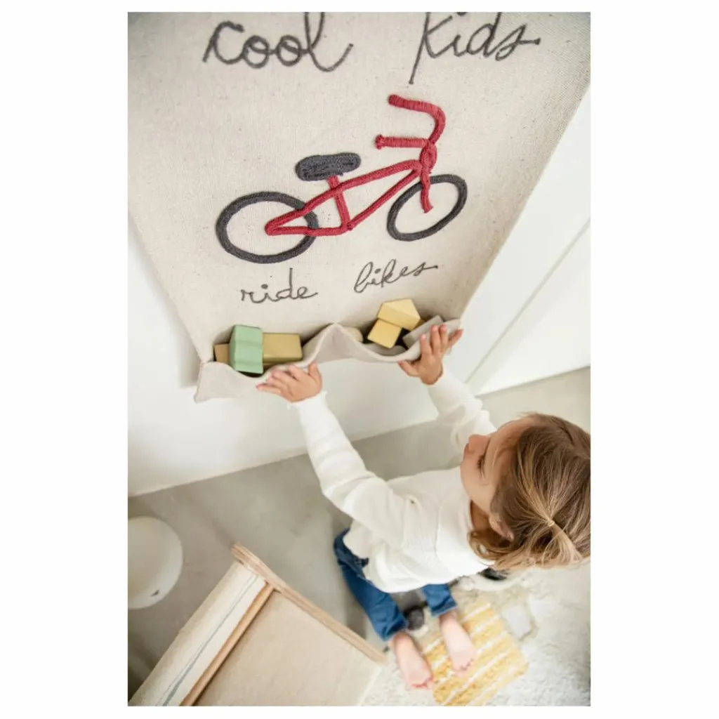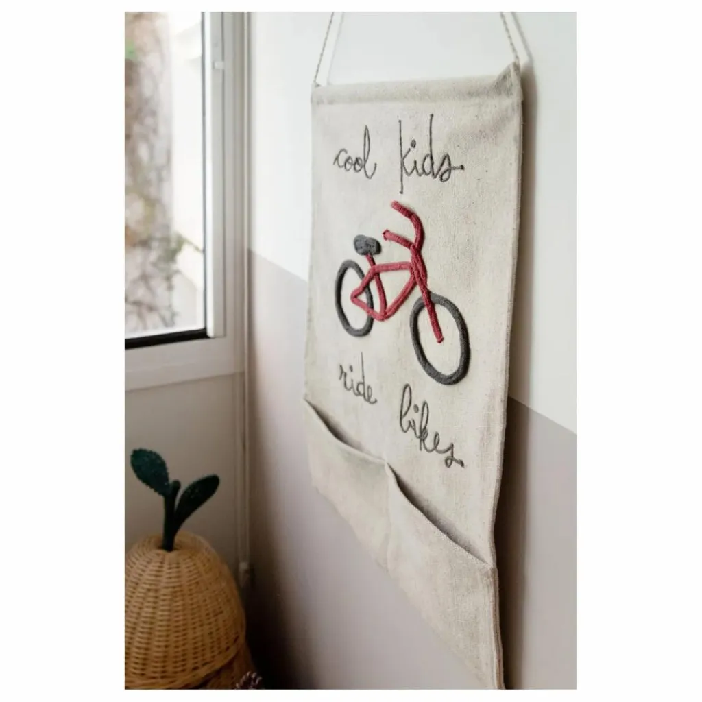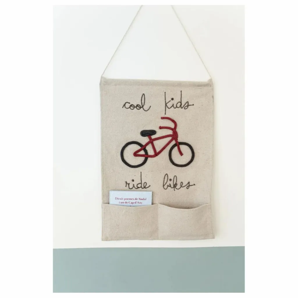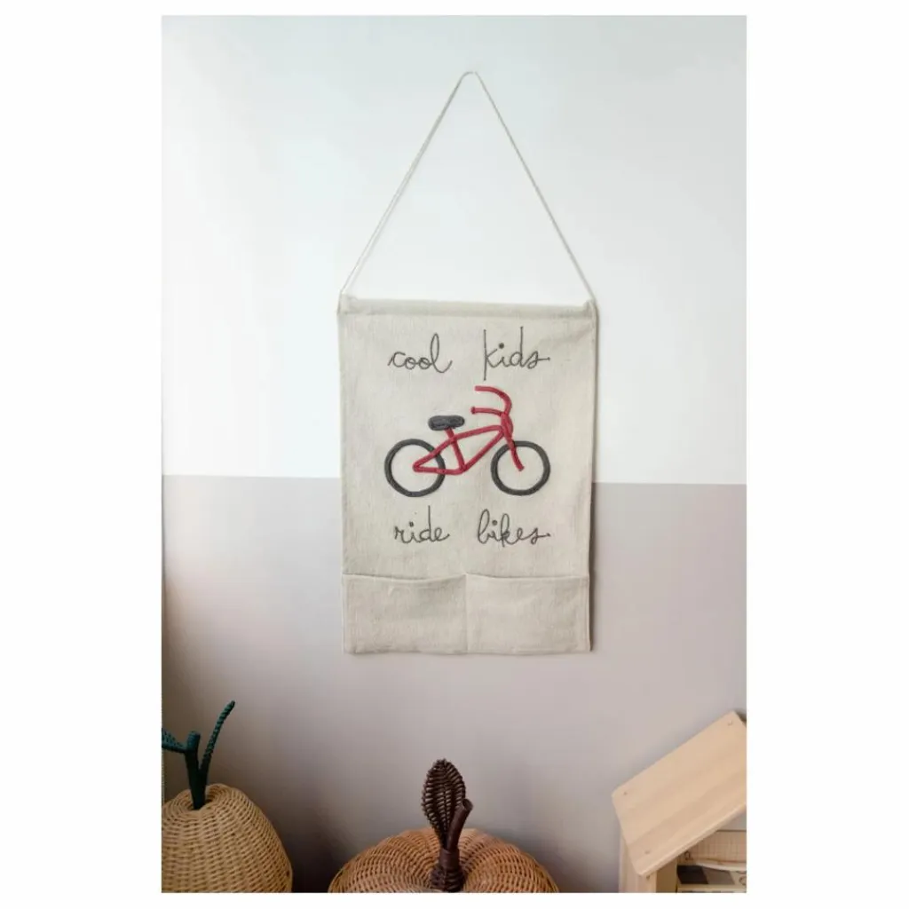 - Porte-manteau mural en toile naturelle non teinte avec le message manuscrit « Cool Kids Ride Bikes » brodé en gris foncé et un vélo cousu à la main en cordons de coton aux couleurs rouge foncé et gris. Le porte-manteau a deux poches pratiques et est attaché à un bâton en bois recouvert de coton. Livré avec une ficelle en coton torsadée pour l’accrocher au mur.