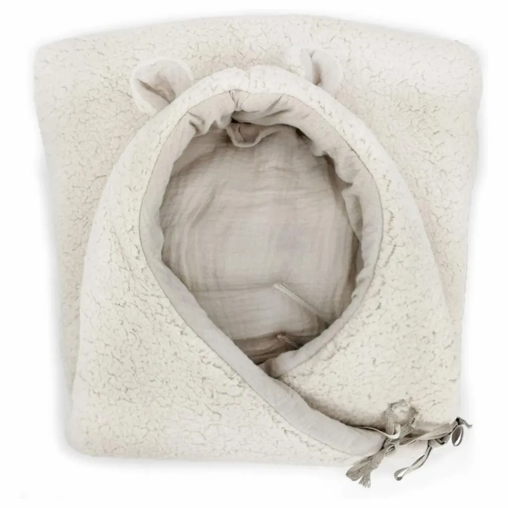 - Nid d’ange avec des oreilles d’ourson. Extérieur en tissu superpolaire ultra doux. Intérieur en coton 100%.