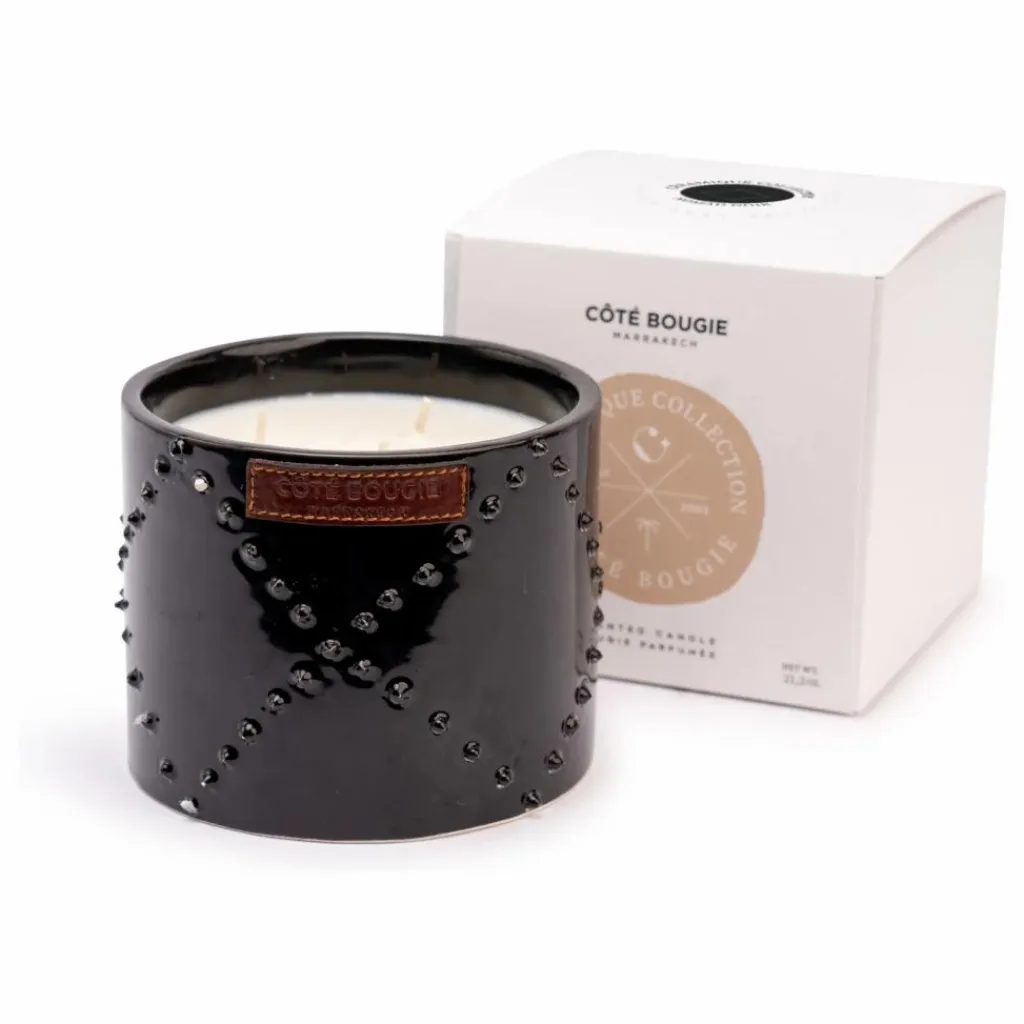 - Bougie parfumée dans un pot en céramique noir, façonné et émaillé à la main à Marrakech. Une pièce design et intemporelle.
