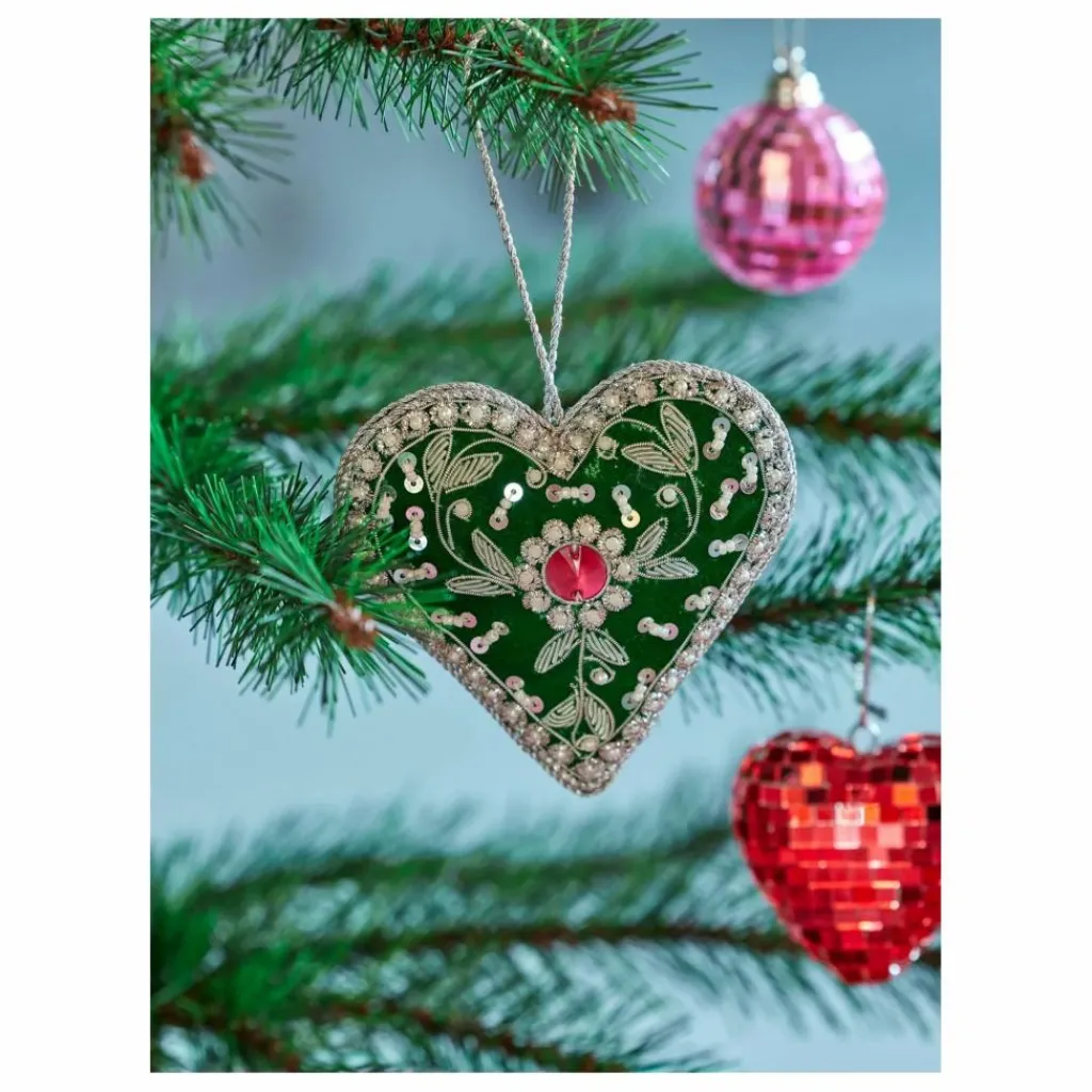 - Ajoutez une touche de magie de Noël à votre maison avec cette charmante décoration faite à la main. En forme de cœur et ornée de délicates perles vertes et argentées, elle attire tous les regards. Elle est parfaite pour votre arbre de Noël, pour être suspendue à la fenêtre ou pour agrémenter une table de fête.
