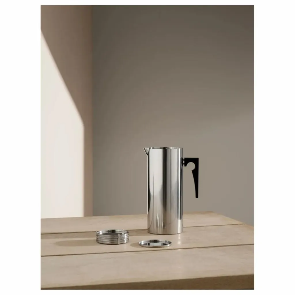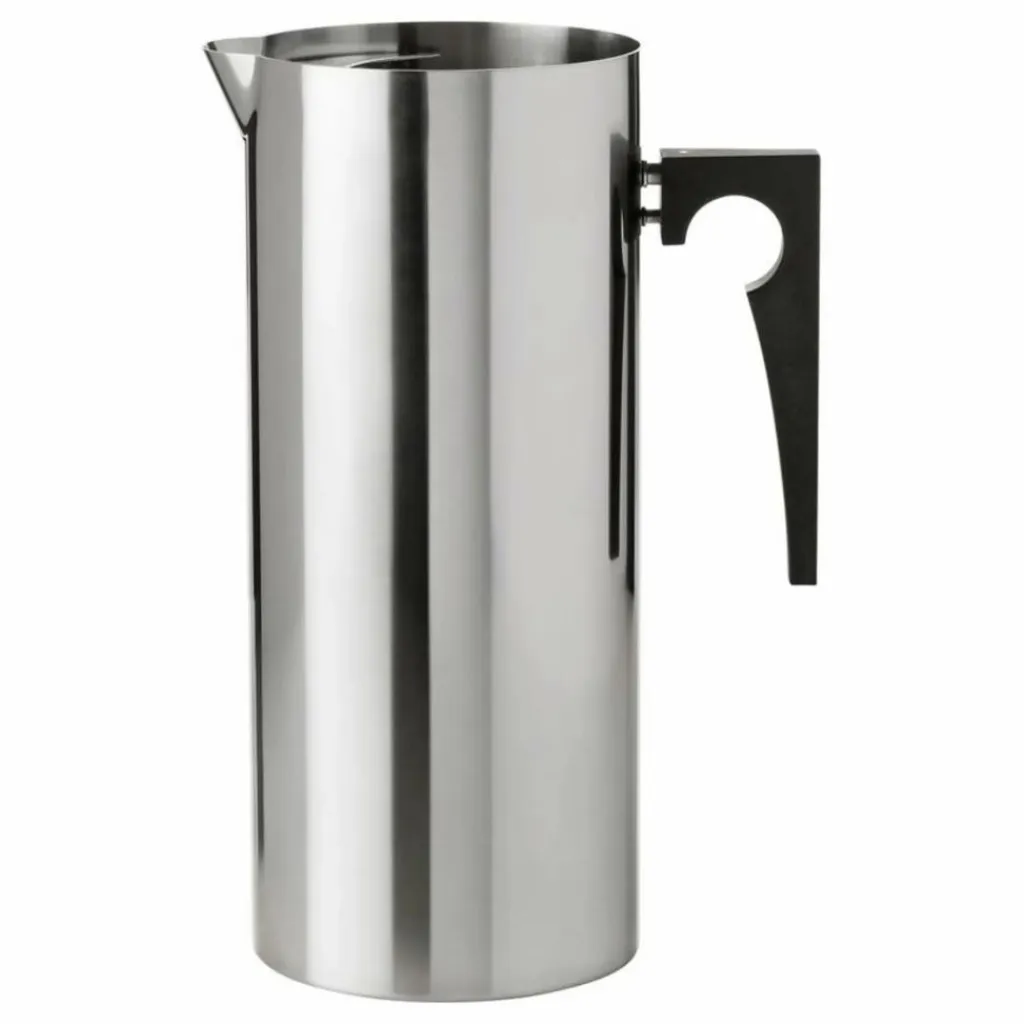 - Le design de la carafe Arne Jacobsen avec lèvre à glace la rend pratique pour un usage quotidien et pour les occasions spéciales. Le pichet en acier inoxydable peut contenir 2 litres d’eau et dispose d’une astucieuse lèvre à glace qui maintient les glaçons dans le pichet et l’eau au frais. Le pichet fait partie de la série Cylinda-line.