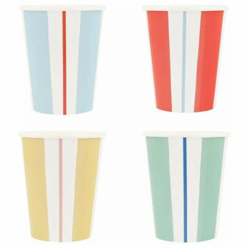 - Ces rayures classiques, aux couleurs primaires amusantes, donneront instantanément une ambiance estivale à vos célébrations. Inspirés des auvents, des transats et des chaises longues, ces gobelets en papier haut de gamme sont parfaits pour les garden-partys, les pique-niques et les fêtes sur la plage et la piscine.
