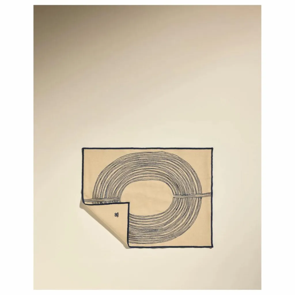 - Broderie couchée, elle consiste à poser un fil épais ou décoratif (dans ce cas, le fil coloré) sur le tissu, sans le faire passer à travers, puis à le fixer à l’aide de petits points de broderie (ici en écru) réalisés avec un autre fil.