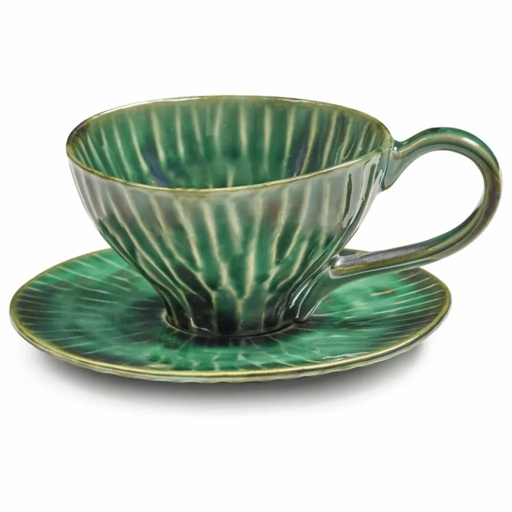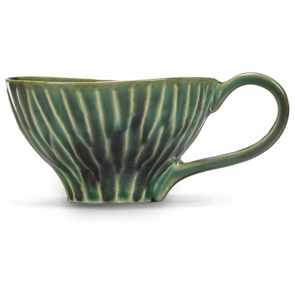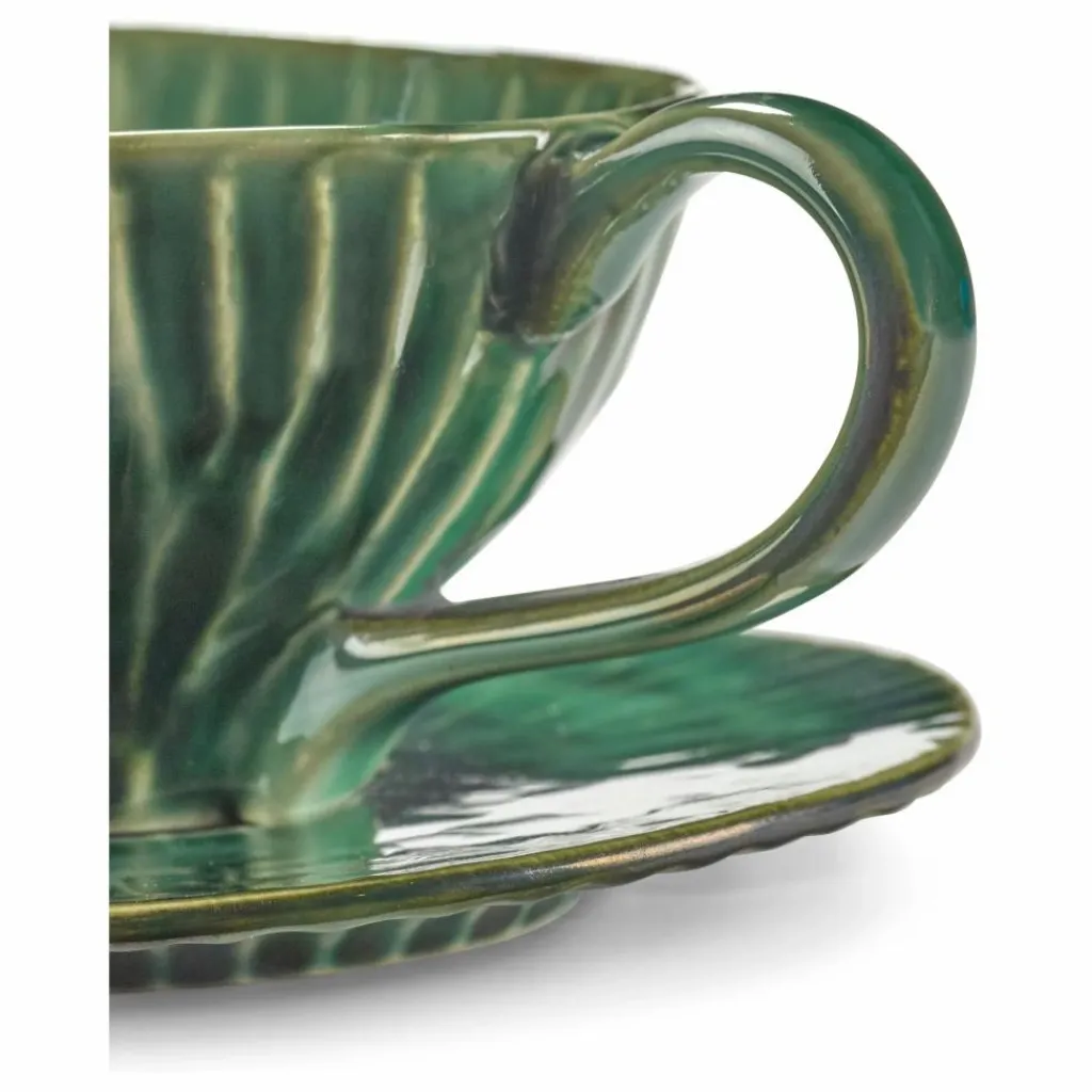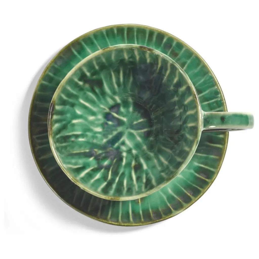 - Pour son dernier livre « Eén Pan », Naessens n’a pas seulement pris la plume, elle est aussi retournée dans son atelier de céramique. Elle a personnellement créé la collection « Verde Lanza », désormais produite en exclusivité par Serax. Le nom fait référence à l’île de Lanzarote, où Naessens réside souvent. Elle s’y est inspirée du vert des fenêtres et des portes en bois, ainsi que des rares plantes qui se détachent sur le paysage lunaire noir. Le vert délavé par le soleil – une teinte qui se marie à merveille avec tout ce qui est délicieux – est rehaussé par la texture en forme de coquillage que Naessens a appliquée avec ses doigts. En bref : cent pour cent Pascale et autant de soleil.