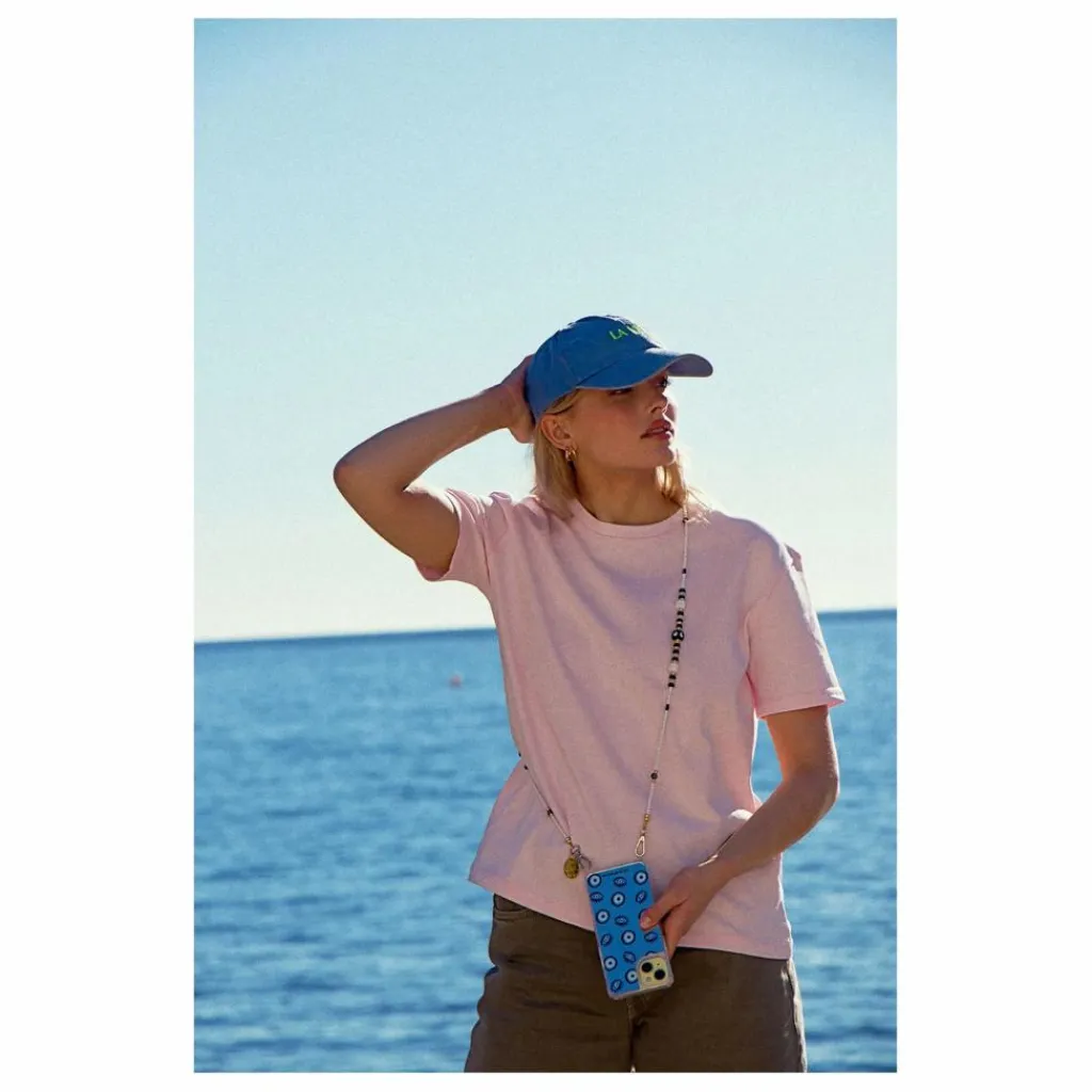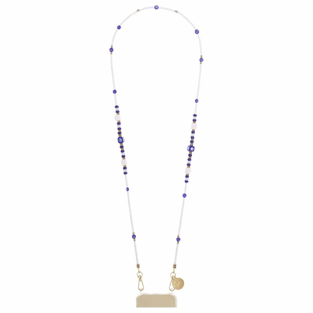 - Notre chaîne de téléphone Filipa, en perles blanches, oeil de Mataki et pampilles dorées à l’or fin, longue de 120 cm, se clipse sur nos coques à anneaux ou notre adaptateur avec ses mousquetons dorés.