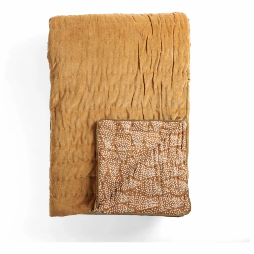 - Un grand couvre-lit en velours de coton uni d’un côté et voile de coton imprimé de l’autre. Avec son graphisme d’inspiration japonaise, le caractère de notre Reiko se lit à travers les détails élégants : son matelassé piqué à la main en rayures, ourlé d’une finition passepoil.