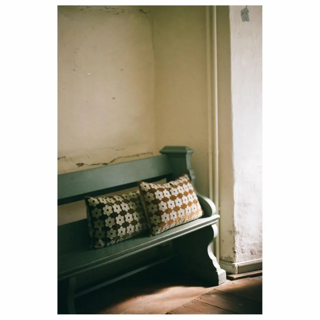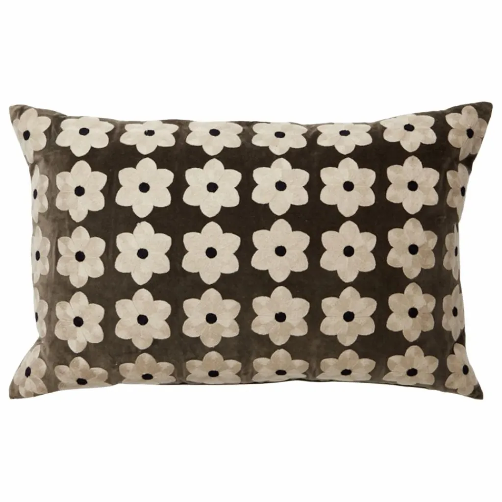 - Housse de coussin en coton/velours avec fleurs brodées et dos en chambray de coton.