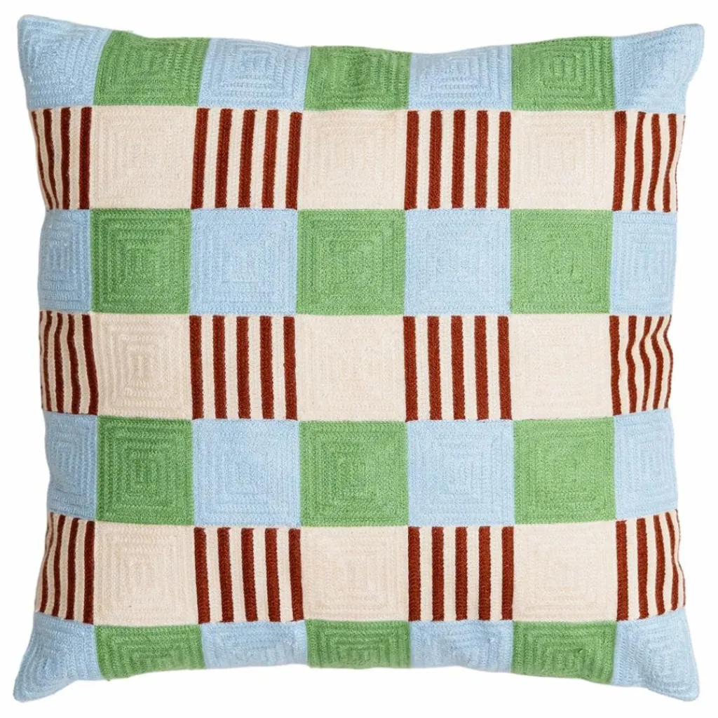 - Ce coussin reprend un motif classique et lui donne une touche ludique de rayures. Il est entièrement brodé à la main, ce qui crée une finition texturée unique. De plus, il arbore notre combinaison de couleurs préférée, si vous ne l’aviez pas encore deviné. Le coussin n’est pas inclus.