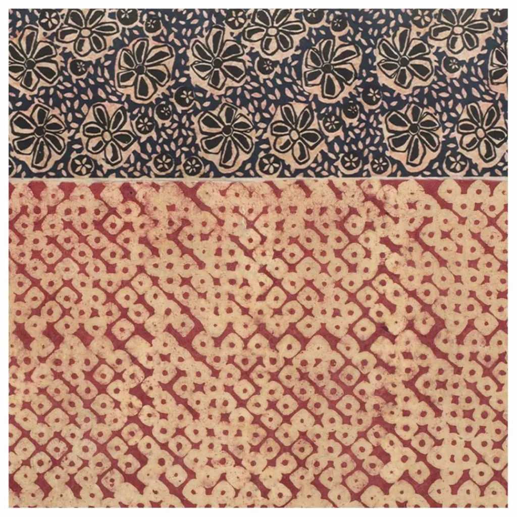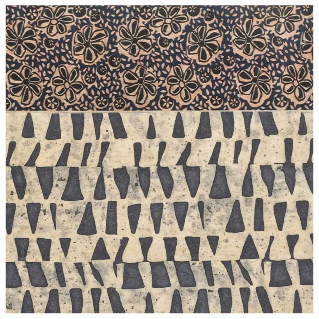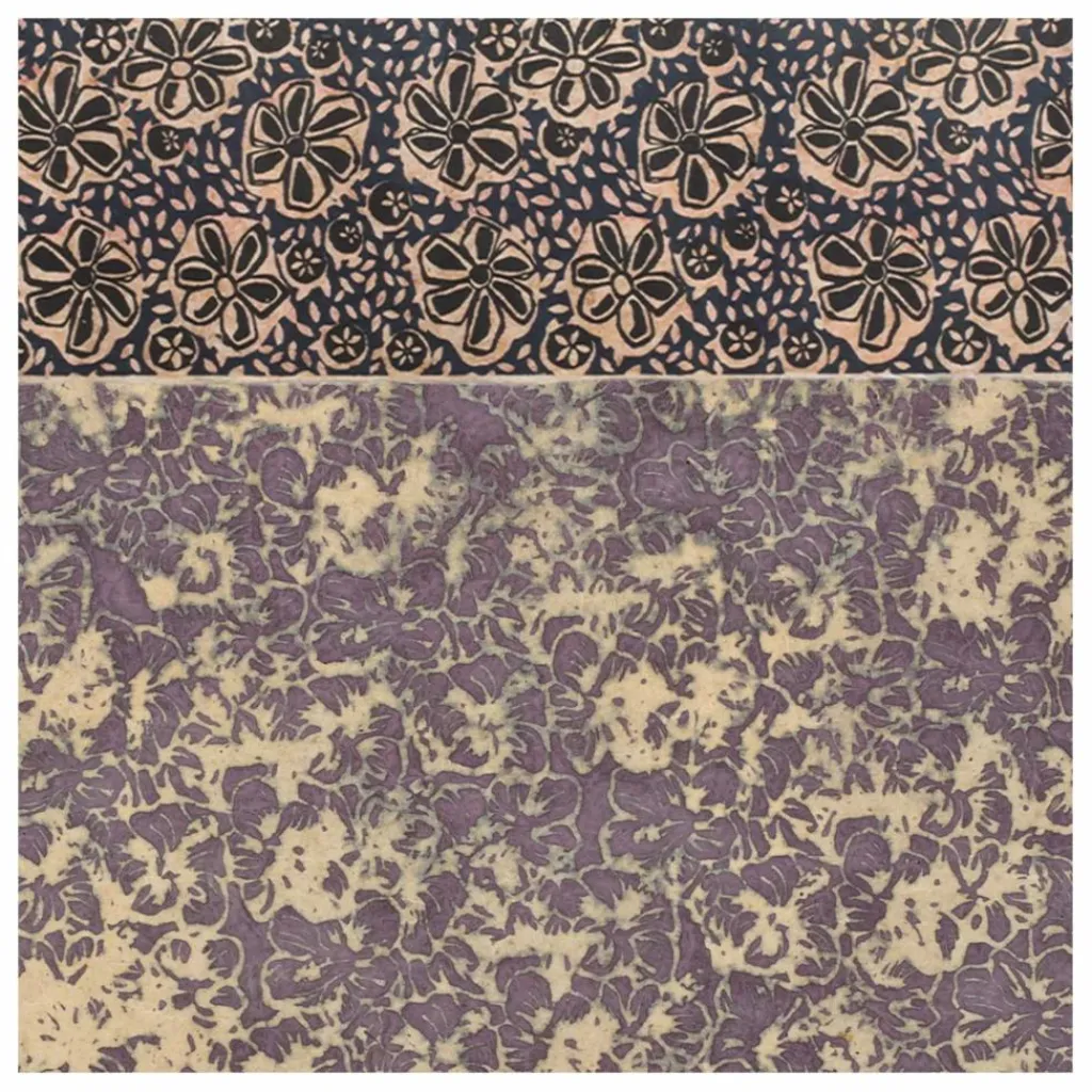 La texture à la cire reste la même que celle des papiers peints ; la différence vient des motifs qui sont sérigraphiés et mélangent deux couleurs imprimées sur un fond naturel. Ils dessinent des pois bronze.